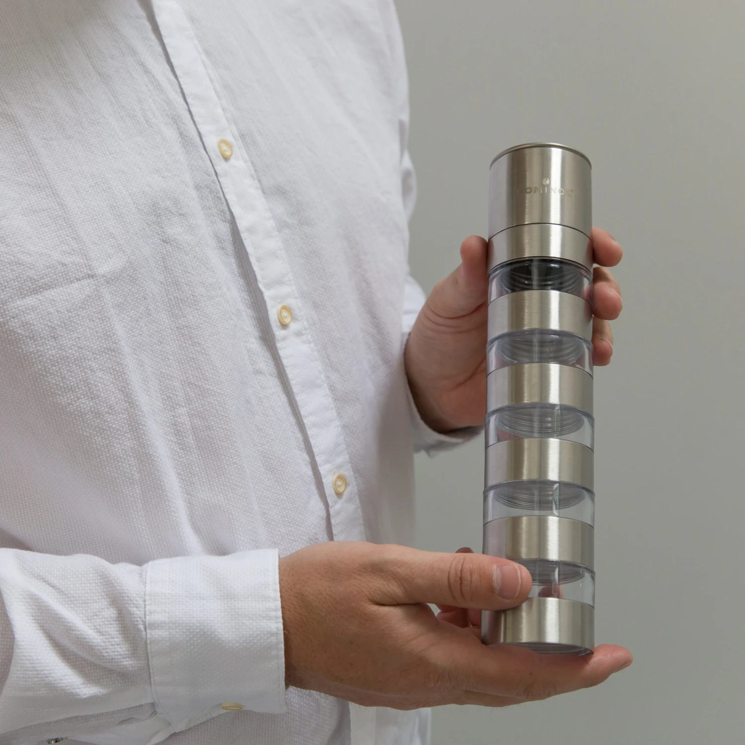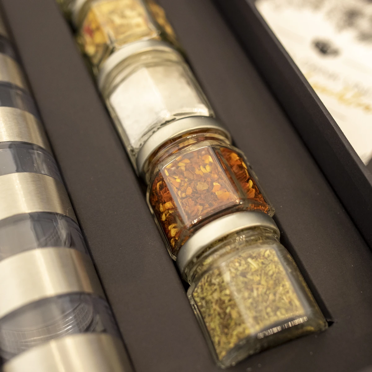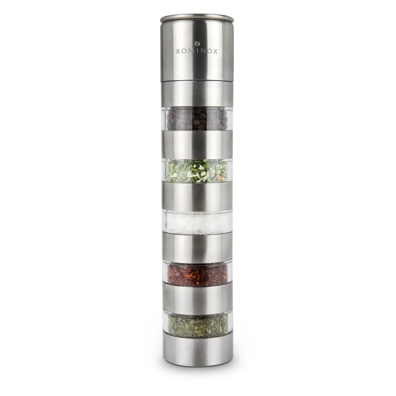 Diese clevere Gewürzmühle mit Keramikmahlwerk von ROMINOX® bietet Platz für 5 verschiedene Gewürze – die Erstausstattung ist gleich mit im Set: ca. 10 g Toskana Mischung, 7 g italienische Kräuter, 15 g geschrotete Chili Schoten, 40 g Salz, 20 g Pfefferkörner. Alles ist verpackt im schwarzen Geschenkkarton, inkl. Einleger mit Beschreibung der Mühle. Viel Spaß beim Würzen!