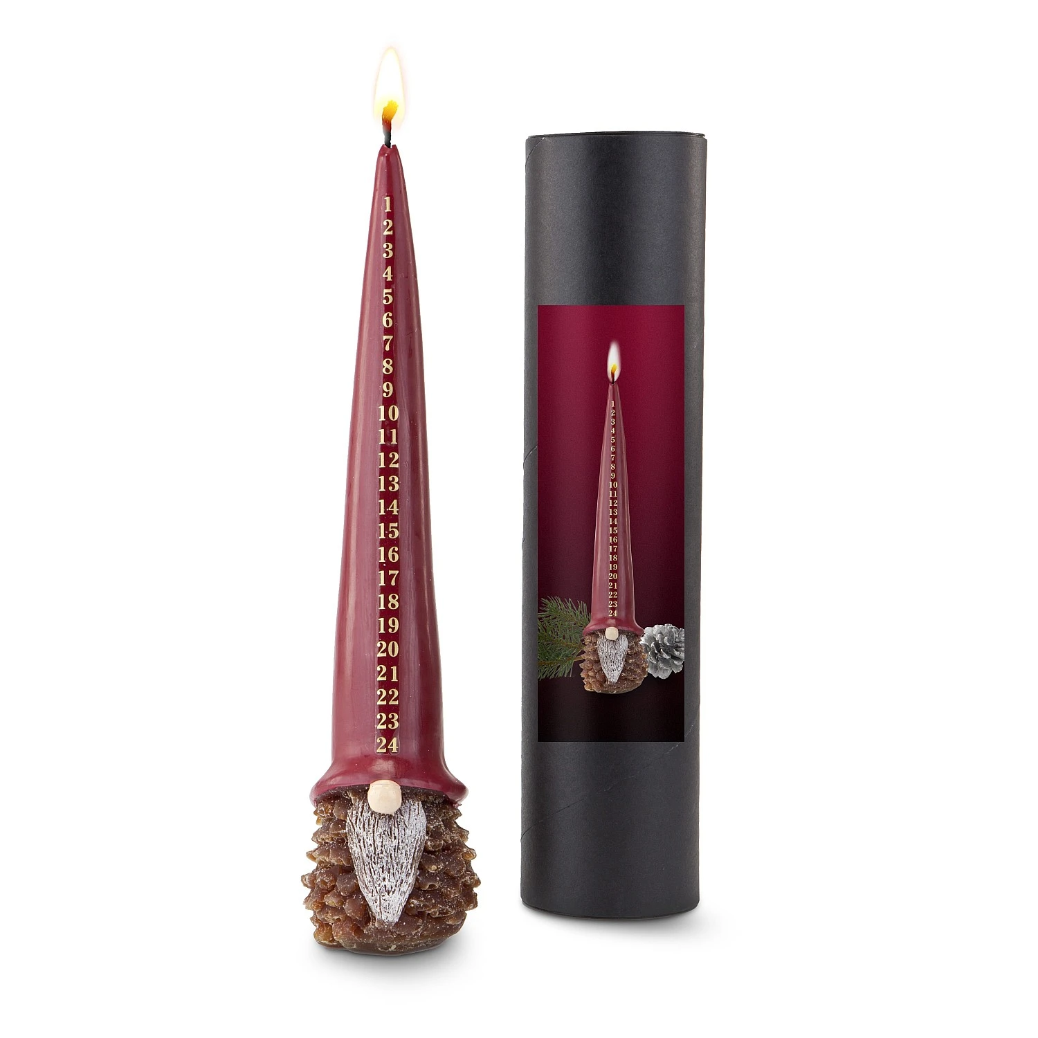 Das ist der (!) Hingucker für jedes Zuhause: ein Adventskalender komplett aus Wachs! Die Zipfelmütze des nordischen Wichtels ist mit goldenen Ziffern bedruckt – von 1 bis hinunter zur 24. Jeden Tag darf die Kerze so lange brennen, bis die nächste Ziffer erreicht ist – und die Zipfelmütze wird immer kleiner. Übrig bleibt am Ende der liebevoll geformte Wichtelkopf mit Knollennase und Tannenzapfenoptik, welcher über die Feiertage Freude bereitet bis er gänzlich abgebrannt ist. Hiermit macht man lieben Menschen eine tägliche Freude.