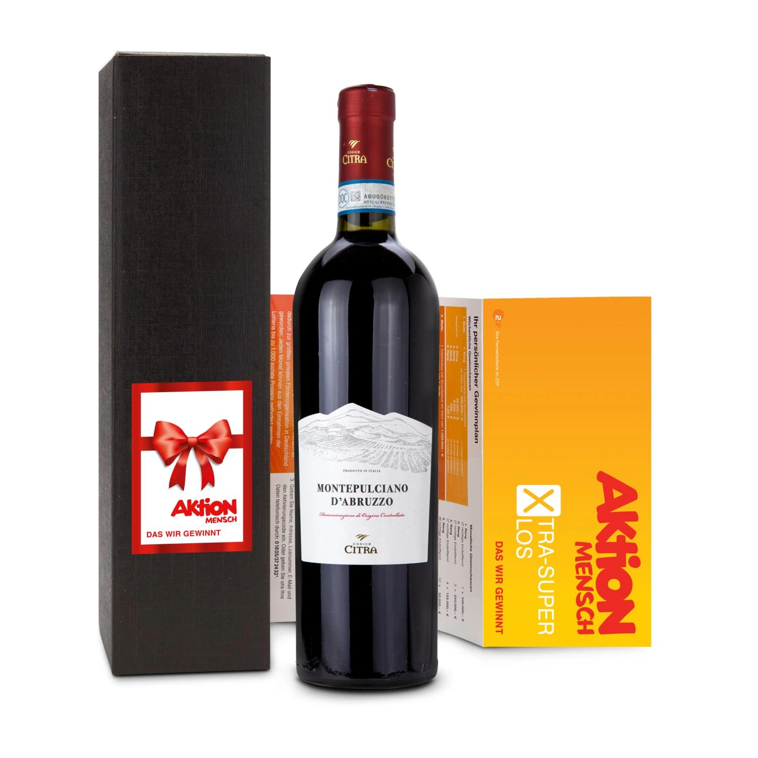 Das „Wir” gewinnt: Verschenke Glück und hilf dabei. Mit diesem Set bekommst Du ein XTRA-SUPERLOS der Aktion Mensch, das nach Aktivierung (die Du oder Dein Kunde vornimmt) 1 Monat lang gültig ist. Woche für Woche Gewinnchancen. Sofort gewinnst Du aber auch schon mit dem Genuss des Montepulciano d‘Abruzzo (0,75 l), der zusammen mit dem Los in einem schwarzen Karton verpackt ist.