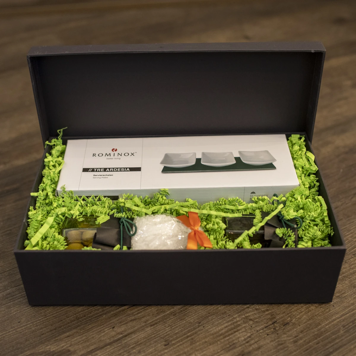 Dekoratives Präsent: 3 Schälchen auf Schieferplatte, servierfertig kombiniert mit schwarzen und grünen Oliven (je 50 g) und 1 Tütchen Salz (ca. 80 g) – in schwarzem Geschenkkarton mit hellgrünem Sizzle.