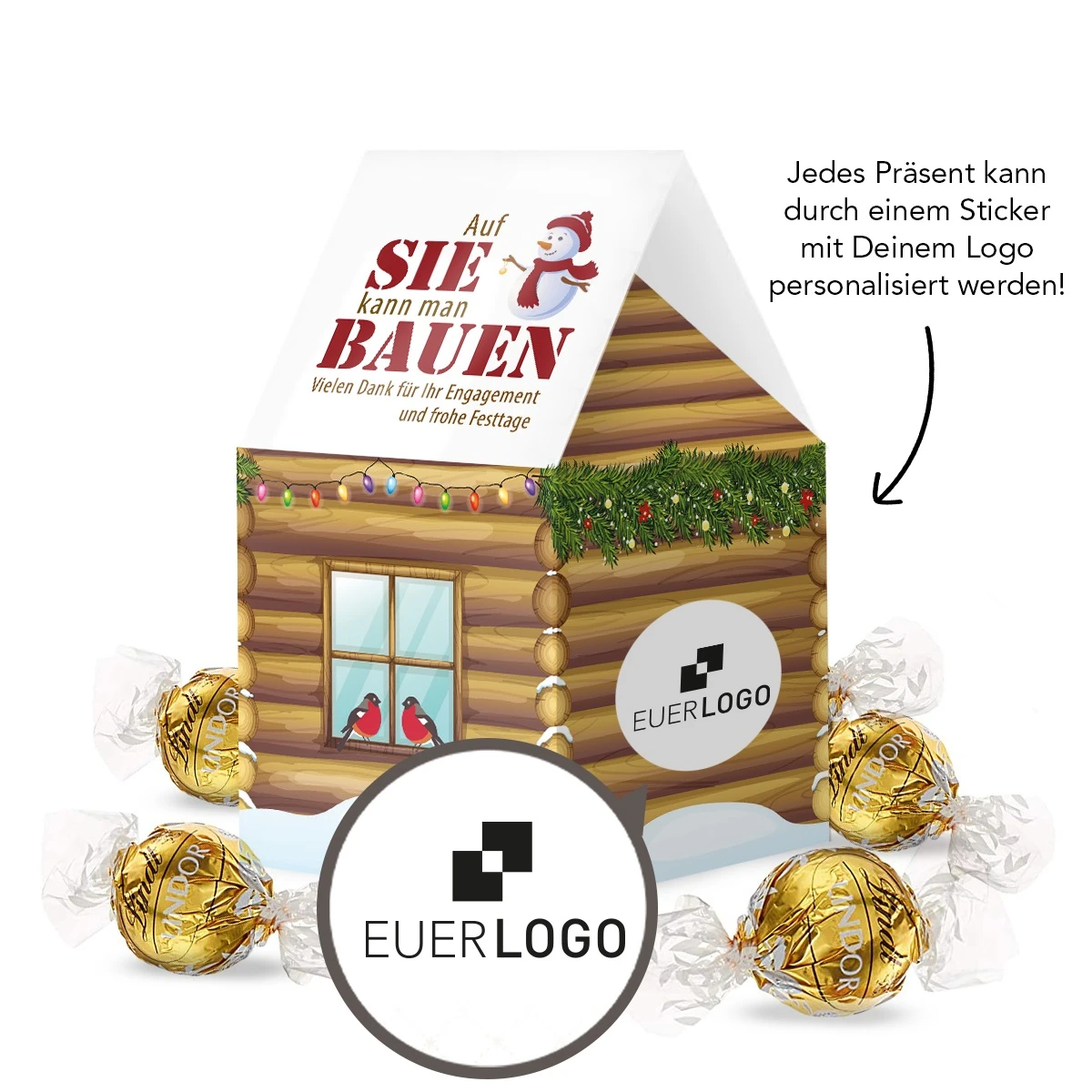 Deine Mitarbeiter sind das Fundament Eurer Firma? Dann sage es ihnen mit diesem originellen Weihnachtshaus und der Botschaft „Auf Sie kann man bauen!“. Bewohnt ist die süße Aufmerksamkeit von 6 zartschmelzenden Lindt Lindorkugeln. Mit diesem kleinen Präsent werden Deine Mitarbeiter und Kunden ganz sicher aus dem Häuschen sein.