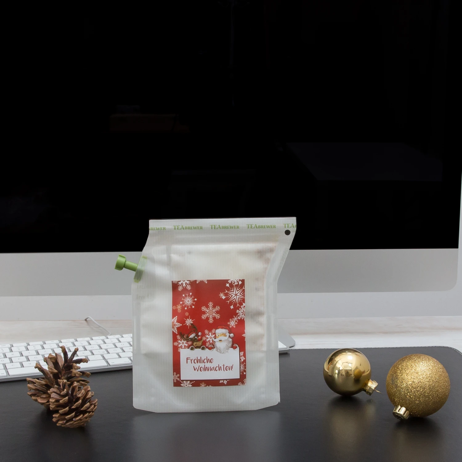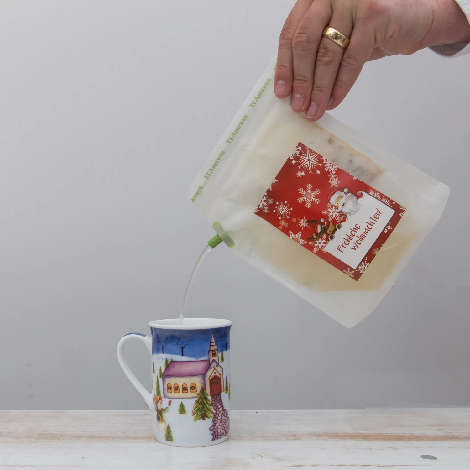 Verschenken Sie Ruhe und Genuss zur Weihnachtszeit: kleines Präsent, große Wirkung! Mit diesen hübschen Brühbeuteln lässt sich die Hektik des Alltags schnell vergessen. Einfach heißes Wasser einfüllen, ziehen lassen, durch den integrierten Filter ausgießen und genießen. Kein Instant-Produkt! Pure Weihnachtsvorfreude! Ideal auch für das Büro oder unterwegs. Ein Beutel ergibt zwei Tassen und kann wiederverwendet werden. Erhältlich in den Varianten „Weihnachts-Früchtetee“ und als „Weihnachts-Kaffee“ mit Fairtrade Bohnen aus Honduras. Eigendesigns auf Anfrage.
