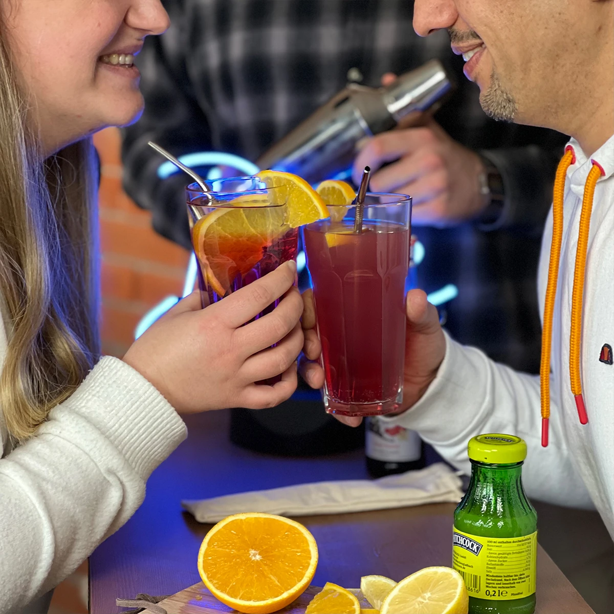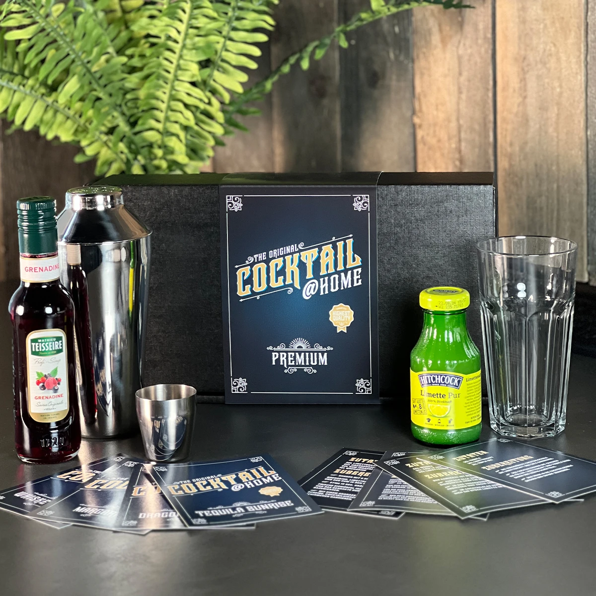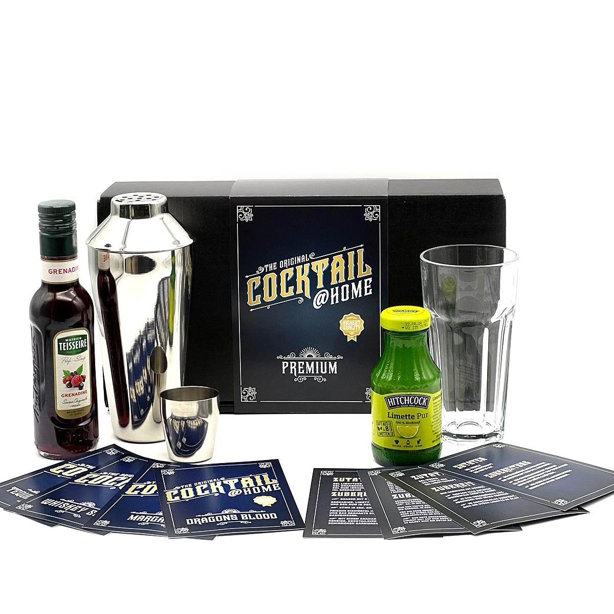 | Material: | 1x Shaker, 1x Cocktailglas, 1x Grenadine Sirup, 1x Lime-Saft, verschiedene Rezeptkarten, 1x Strohhalm |
