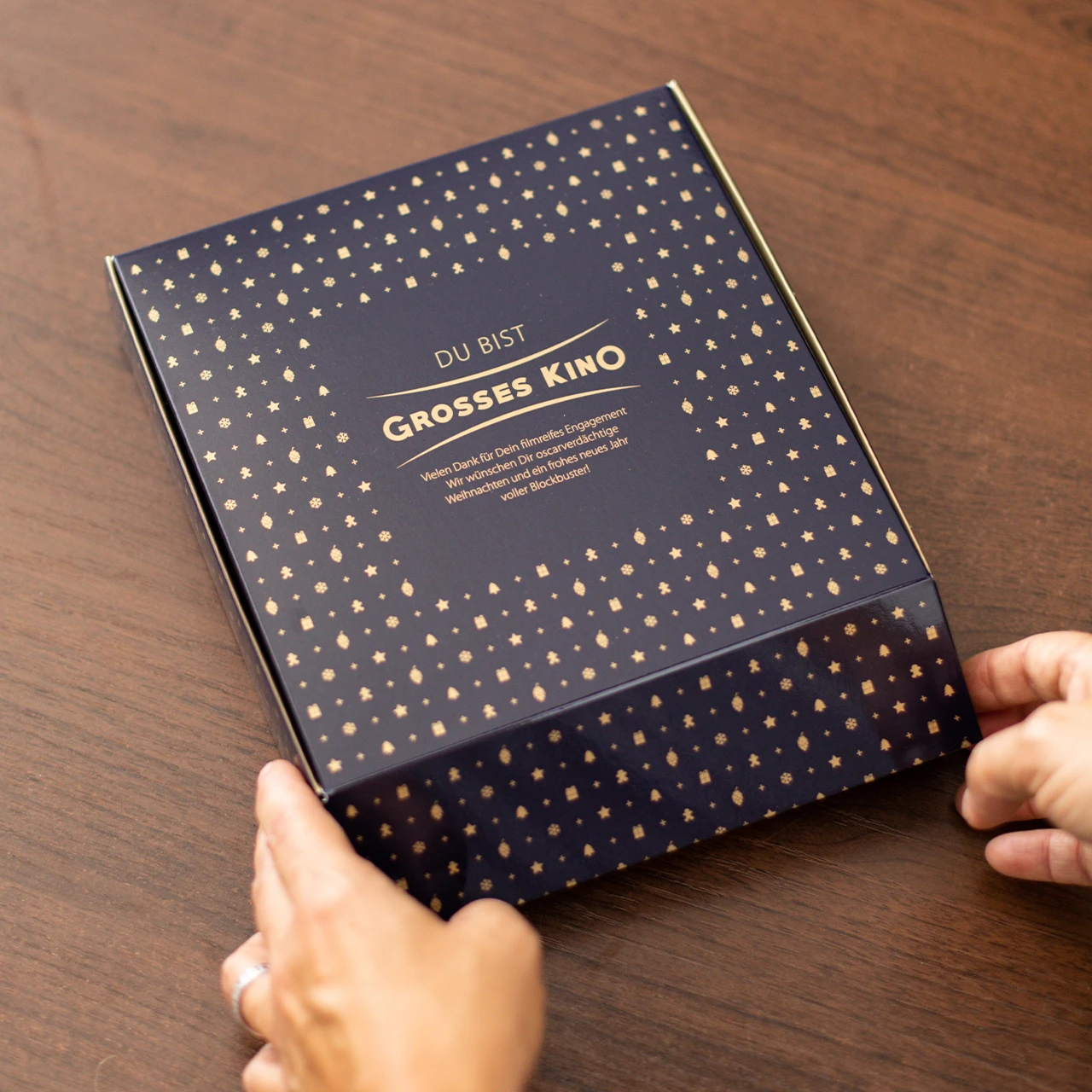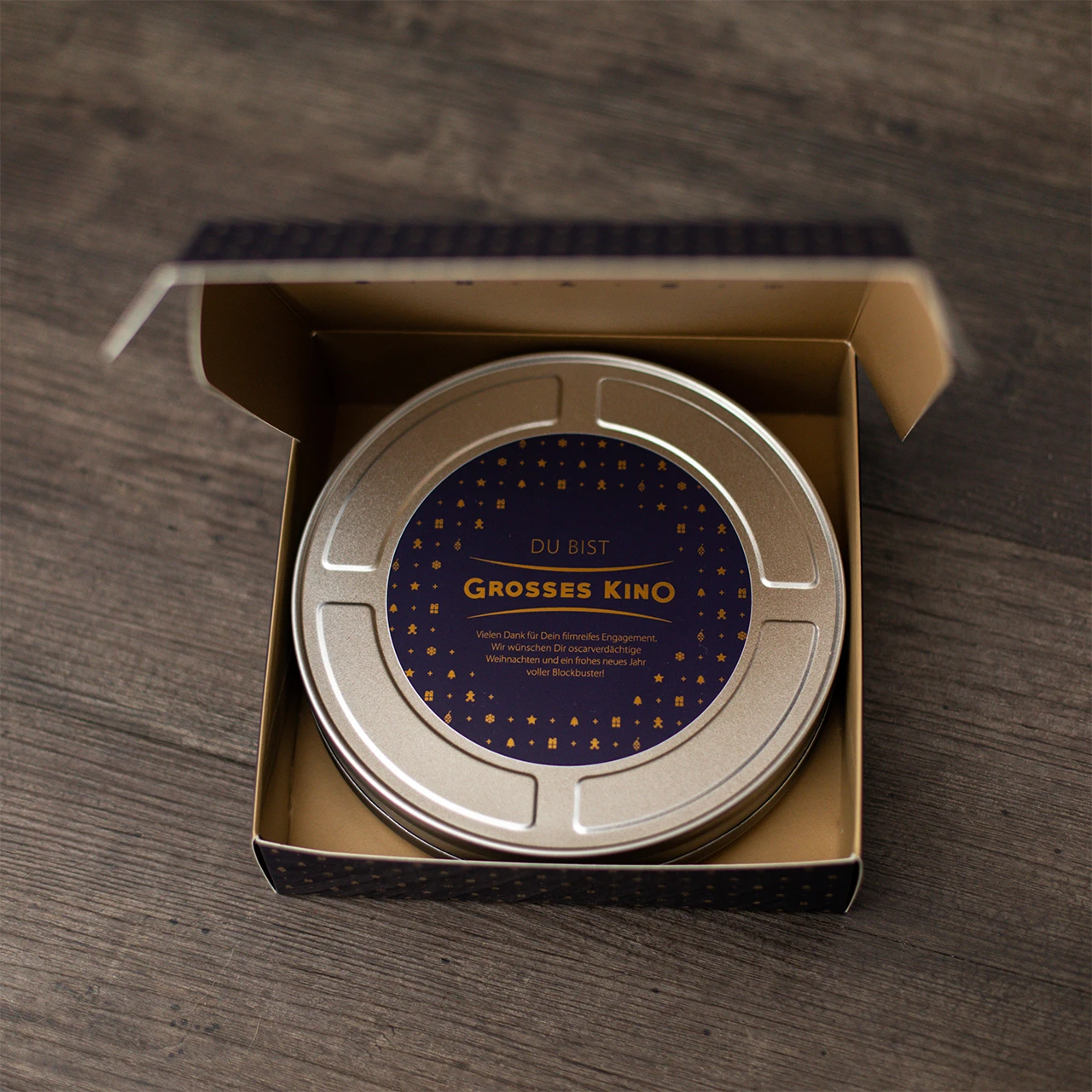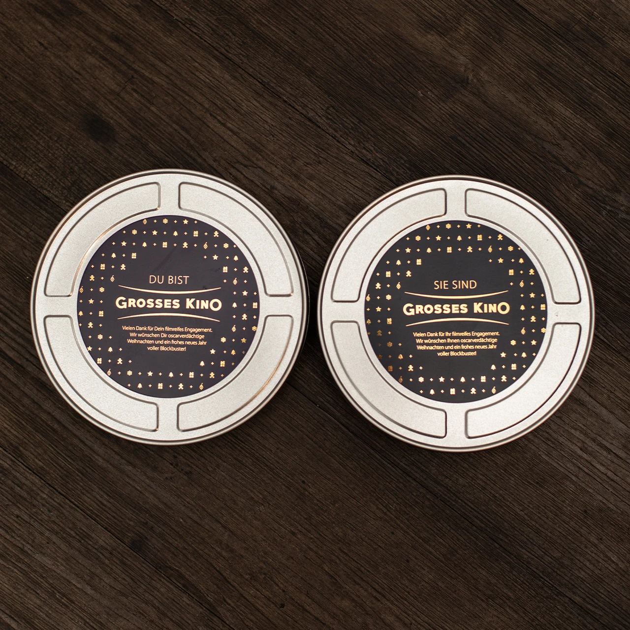 - Aufdruck: „Du bist großes Kino – Vielen Dank für Dein filmreifes Engagement. Wir wünschen Dir oscarverdächtige Weihnachten und ein frohes neues Jahr voller Blockbuster!“