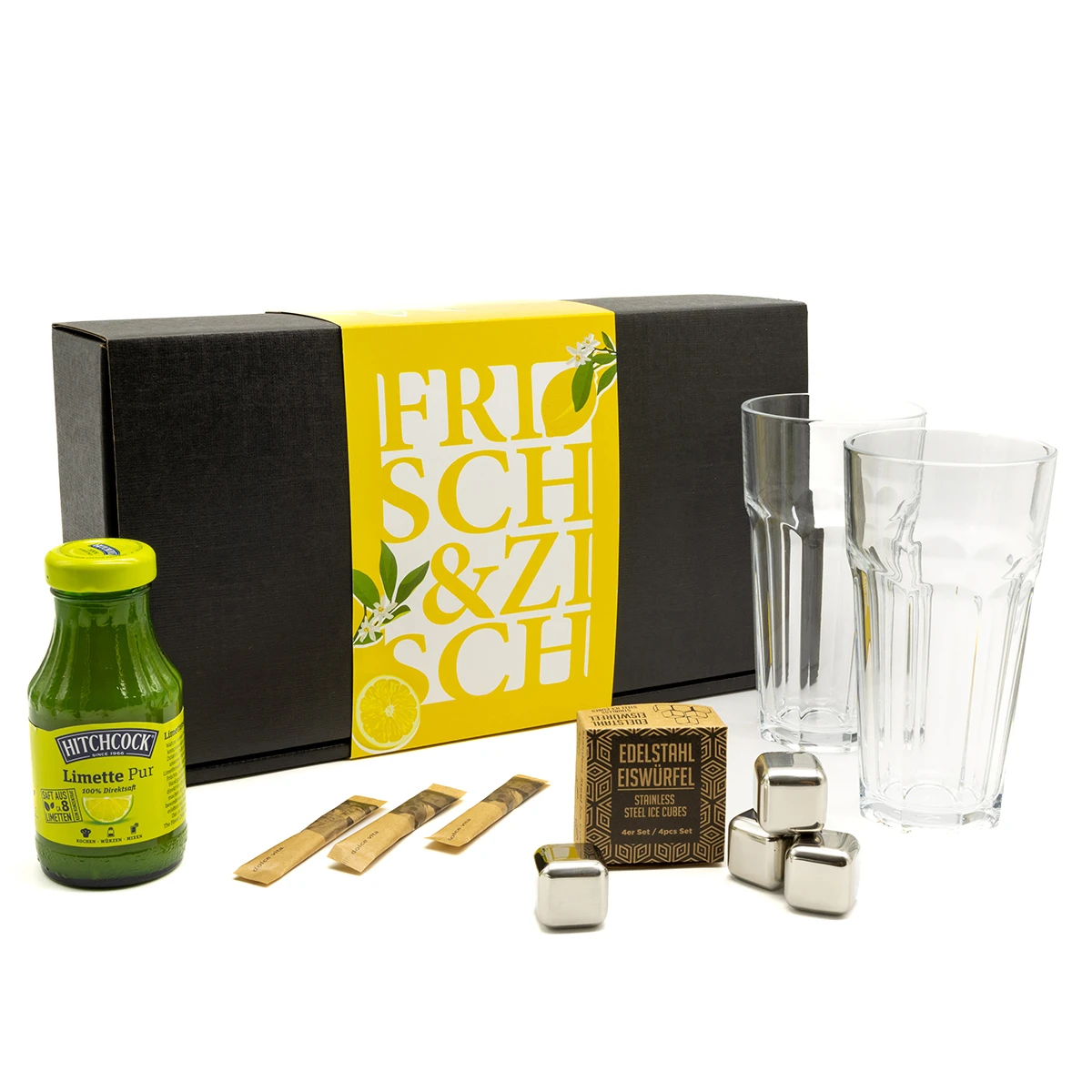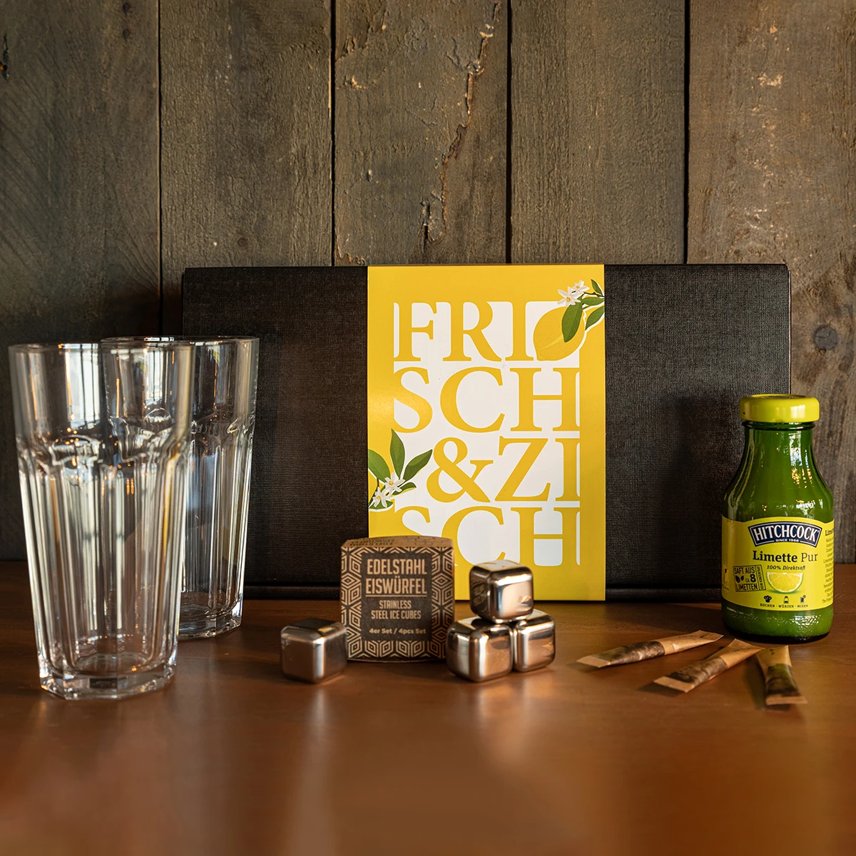 Das Frisch & Zisch – Geschenkset hält ganz viel Frische und gute Laune bereit und ist mit verschiedenen Zutaten für einen gemütlichen Sommerabend gefüllt. Die Präsentbox besticht durch ein farbenfrohes, sommerliches Design und enthält zwei Cocktailgläser, eine Flasche Limettensaft, drei Zuckersticks und ein 4er Set wiederverwendbare Eiswürfel. So bringst du Deine Mitarbeiter erfrischt durch die warmen Sommertage. Und das Beste: Wir verleihen Deinem Geschenk gerne das gewisse Etwas und drucken auf Wunsch jeden einzelnen Namen deiner Beschenkten individuell auf die Geschenkbanderole.