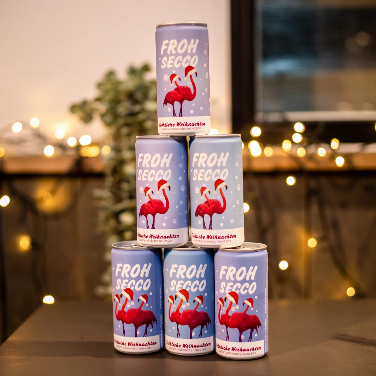 Mit „FrohSecco“ verschenkst Du 6 Mal einzigartig prickelnde Weihnachtsfreude. Der Secco in der 200 ml Dose ist eine weihnachtlich sympathische Aufmerksamkeit für Mitarbeiter, Kunden und Geschäftspartner.