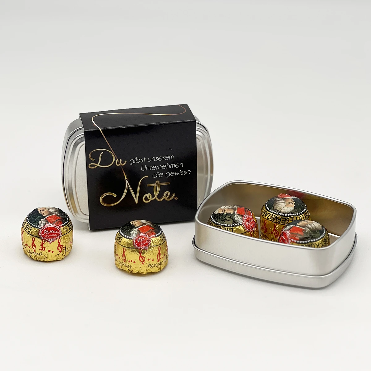 Ganz anders ist das mit unserer mattsilbernen Dose, die die Botschaft „Du gibt’s unserem Unternehmen die gewisse Note“ trägt und damit nachhaltig und unvergesslich Deine Wertschätzung ausdrückt. Entsprechend der Botschaft ist die Metalldose gefüllt mit 5 Mozartkugeln – der weltbekannten hochwertigen Schokoladenspezialität.