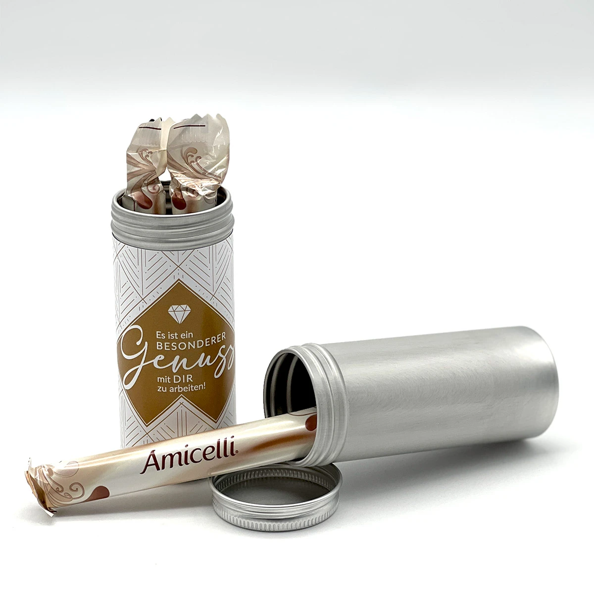 Damit Deine Anerkennung mindestens ebenso gut zur Geltung kommt, haben wir hier das perfekte Präsent für Dich. Unsere hochwertige Dose trägt die Botschaft „Es ist ein besonderer Genuss mit DIR zu arbeiten!“ und ist gefüllt mit 4 köstlichen, knusperleichten Amicelli-Stangen. Damit drückst Du nicht nur Deine Freude über Dein Team sowie Deine Wertschätzung aus, sondern sorgst außerdem dafür, dass der gute Workflow von allen wahrgenommen und vor allem auch weiter gepflegt wird.