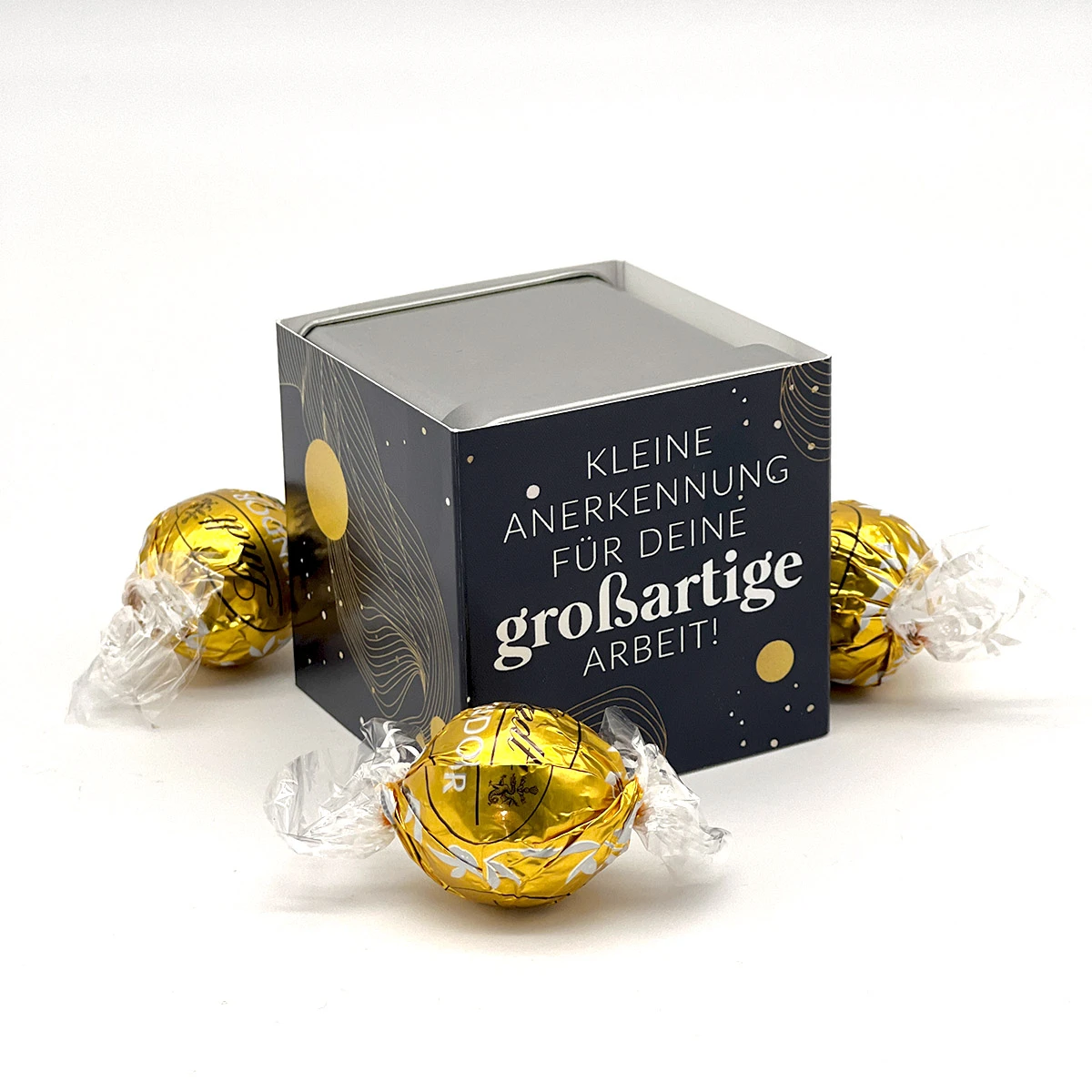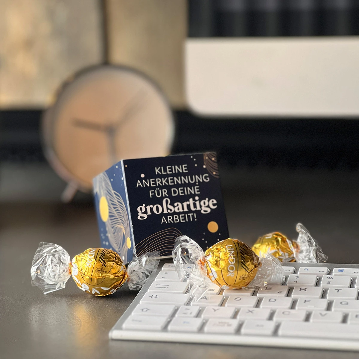 Dann zeige ihnen, dass Du ihre großartige Arbeit siehst und schenke ihnen ein wertschätzendes Präsent. In unserer hochwertigen, wiederverwendbaren Silberdose mit der Botschaft „Kleine Anerkennung für Deine großartige Arbeit!“ verstecken sich drei zartschmelzende Lindor-Pralinés. So verschenkst Du eine kleine Anerkennung mit großer Wirkung und bringst Deinen Mitarbeitern die Wertschätzung entgegen, die sie verdient haben.