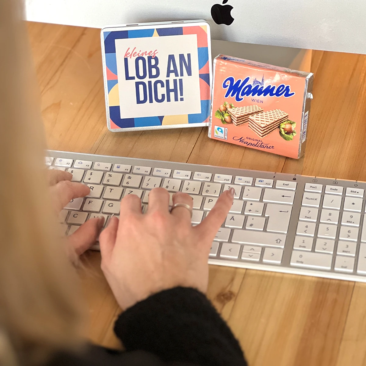 Dann ist es an der Zeit ihnen das auch zu sagen und ihnen zu zeigen, dass Du ihre großartige Arbeit wahrnimmst und dankbar dafür bist. Mit unserer hochwertigen und wiederverwendbaren Dose, gefüllt mit dem Waffel-Klassiker „Manner“, bringst Du Deine Wertschätzung zum Ausdruck. Neben einer leckeren Waffel-Schnitte erwartet Deine Mitarbeiter die Botschaft „Kleines Lob an Dich“. So verschenkst Du eine kleine Aufmerksamkeit mit großer Wirkung und bringst Deinen Mitarbeitern die Wertschätzung entgegen, die sie verdient haben.
