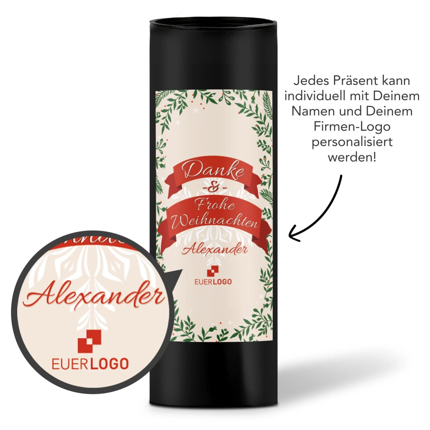 Und da Weihnachten fast nix unmöglich ist, können wir jede Hülse ab 1 Stück mit Namen und Eurem Logo individualisieren. Auf Wunsch lässt sich das Etikett auch an Eure Firmenfarben anpassen. Eine Karte und ein komplettes Geschenkset sind optional ebenfalls erhältlich.