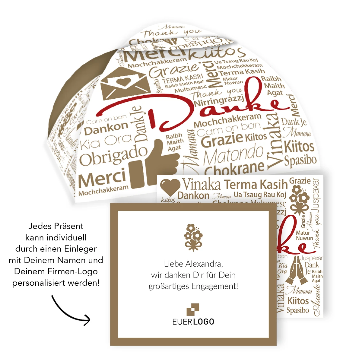 Übrigens: Wenn wir den Namen jedes einzelnen Empfängers oder Dein Firmenlogo auf den Einleger der Verpackung drucken, wird Deine Überraschung noch persönlicher. Darüber hinaus unterstützen wir Dich gerne bei der Logistik: Wir lagern für Dich und schicken Dein Präsent zuverlässig und pünktlich an Deine Wunschadresse.