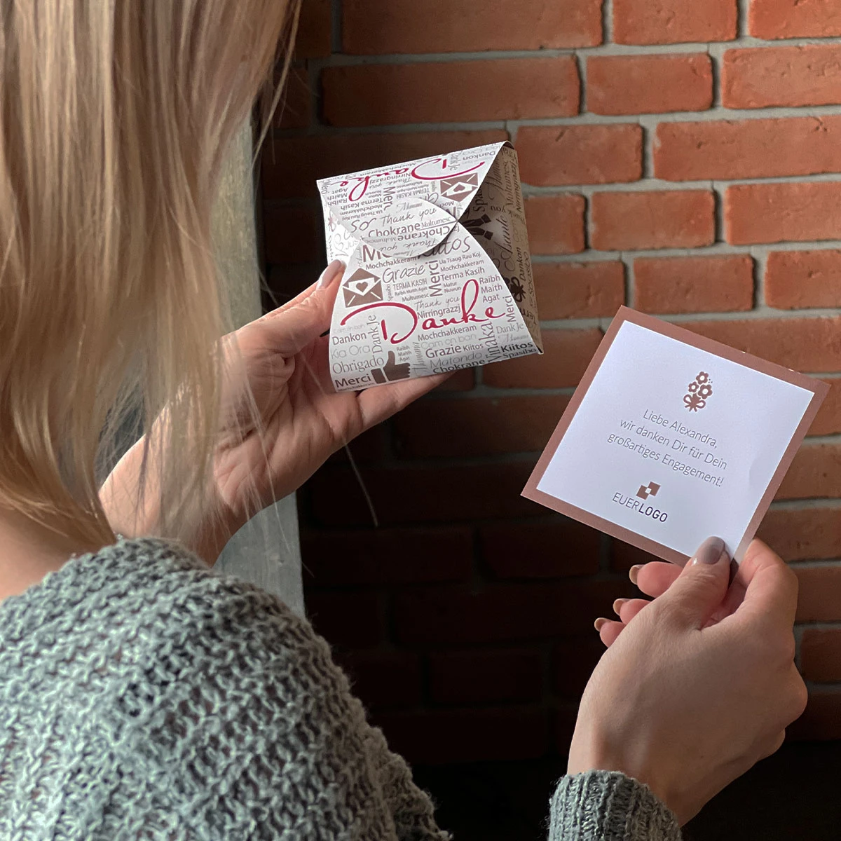 Übrigens: Wenn wir den Namen jedes einzelnen Empfängers oder Dein Firmenlogo auf den Einleger der Verpackung drucken, wird Deine Überraschung noch persönlicher. Darüber hinaus unterstützen wir Dich gerne bei der Logistik: Wir lagern für Dich und schicken Dein Präsent zuverlässig und pünktlich an Deine Wunschadresse.