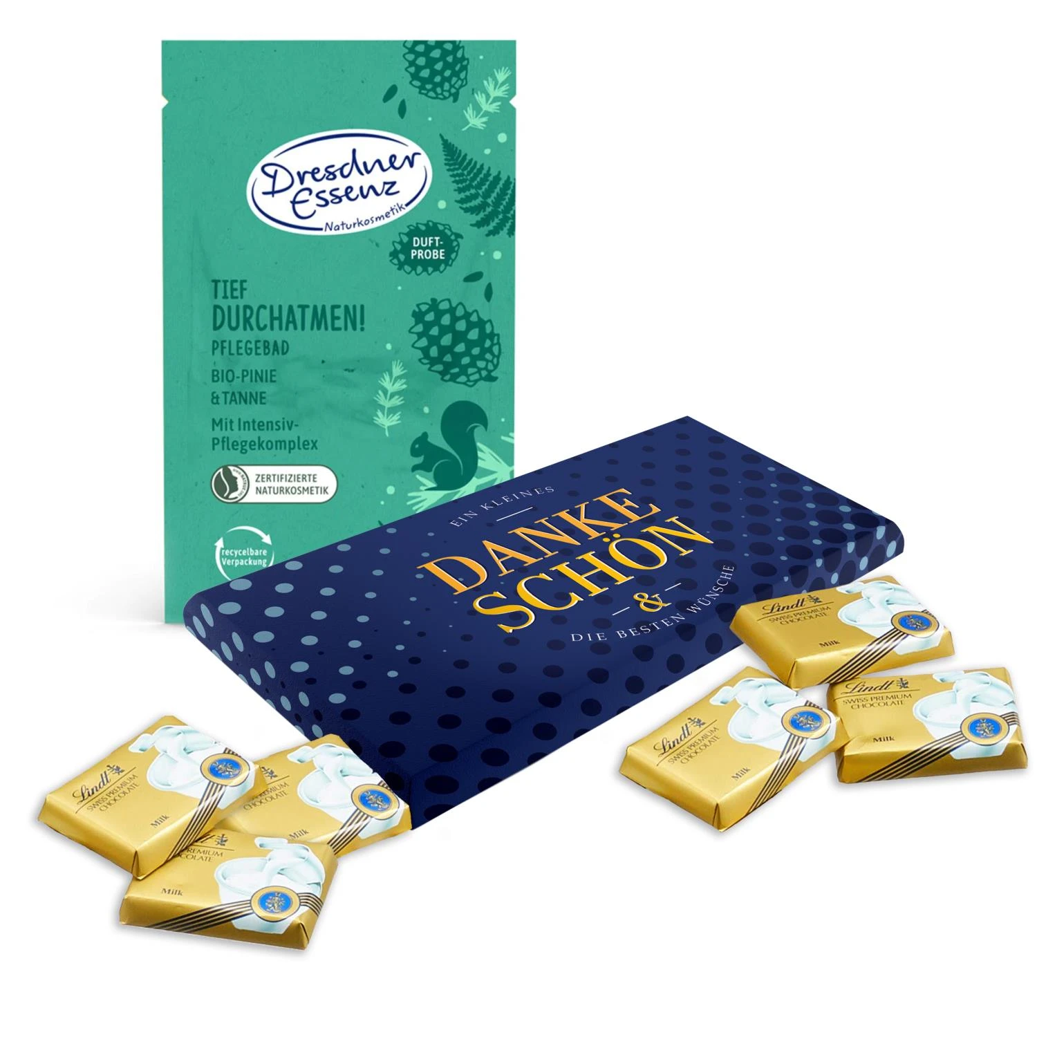 | Material: | 1x Kleines Dankeschön – Lindt, 1x Badesalz Dresdner Essenz – 60g, 1x Design-Banderole |