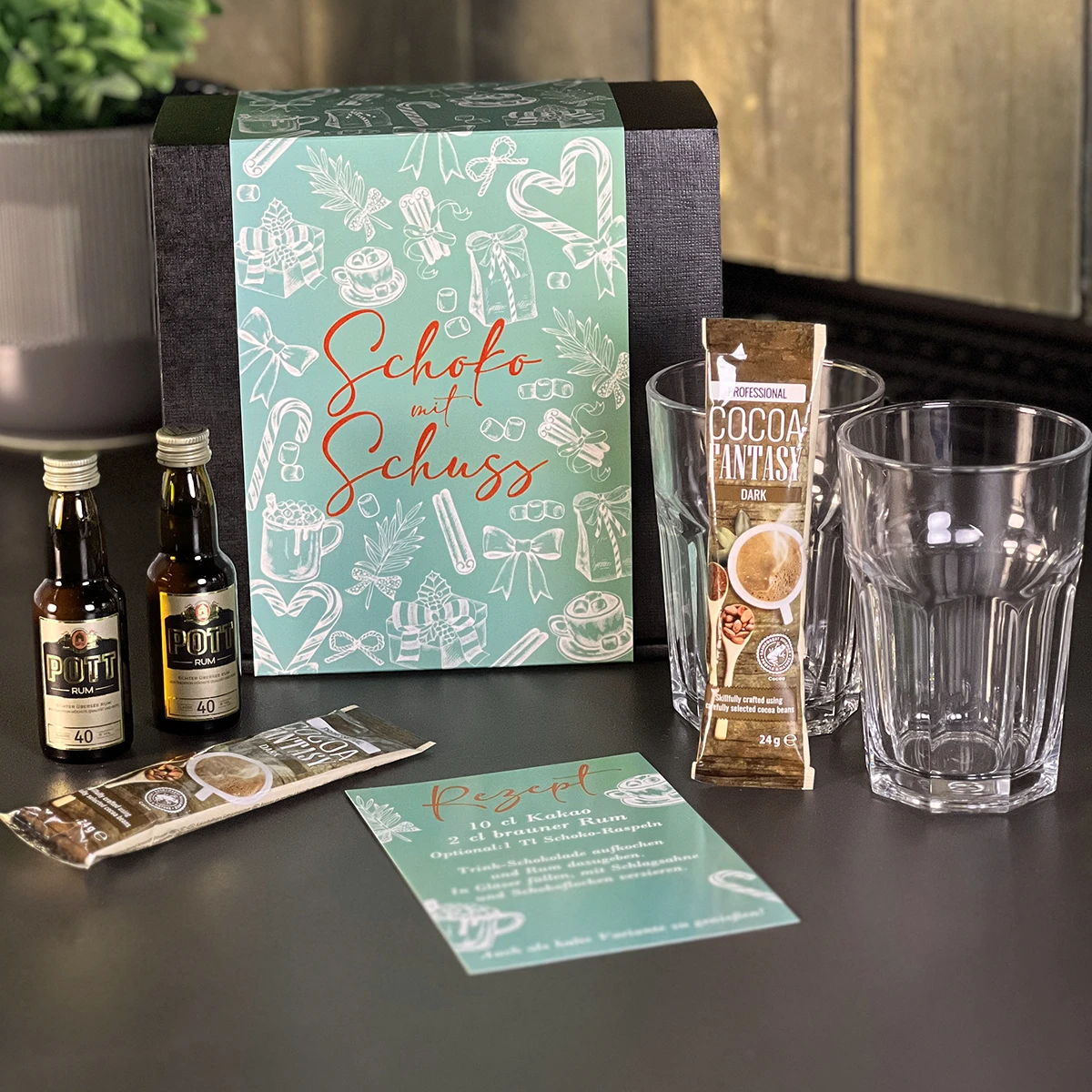 | Material: | 2x Fläschchen hochprozentiger Rum (0,04l), 2x leckere Trinkschokolade, 2x stilvolles Longdrinkglas, 1x Rezeptkarte, 1x Geschenkkarton, 1x Design-Banderole |