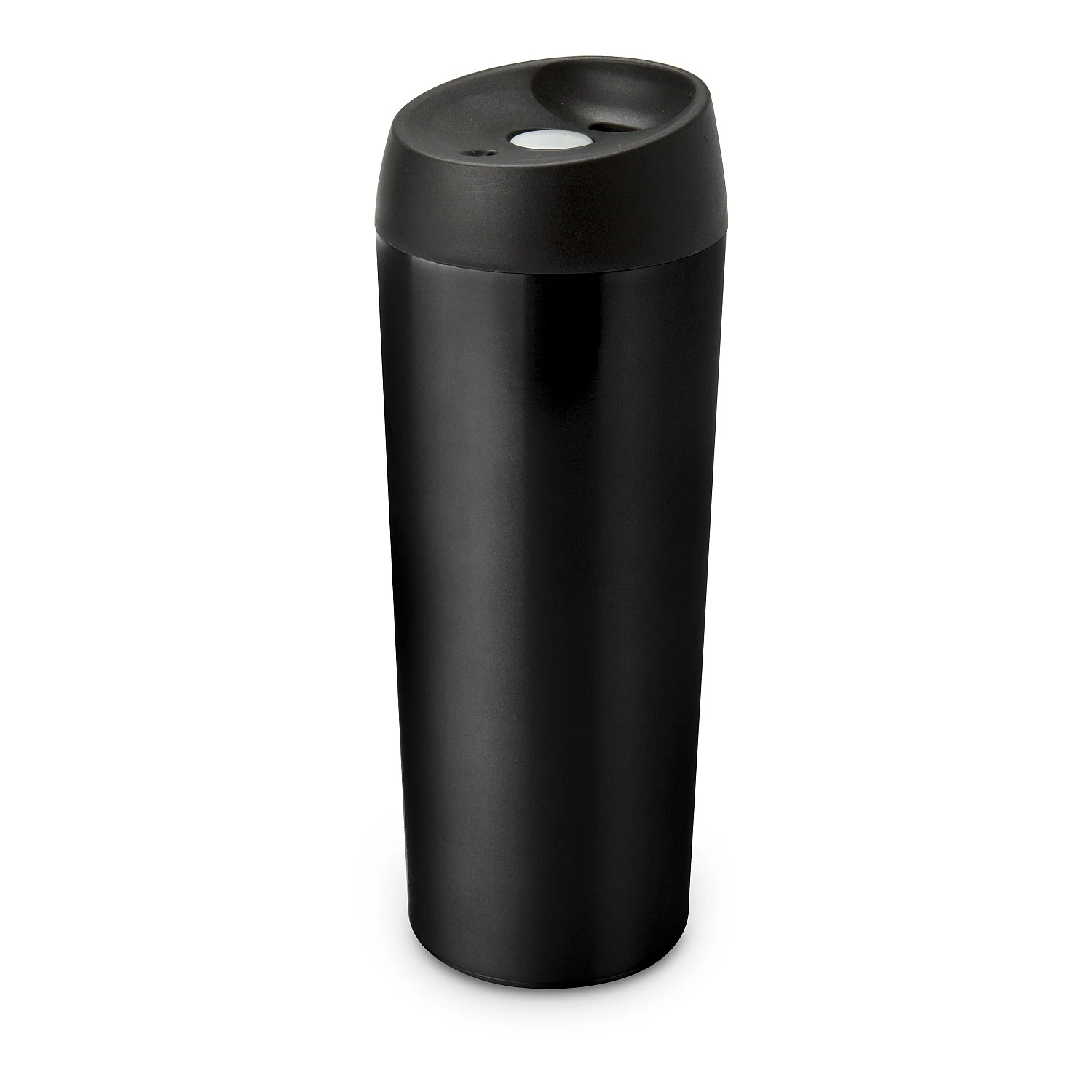 Praktischer Thermobecher – ergonomisches Design, platzsparend, leicht, stabil, dicht, isolierende Doppelwand, auf Knopfdruck trinkbereit, 500 ml (Edelstahl – schwarz matt lackiert, Kunststoff). Verfügbar in Silber oder Schwarz.