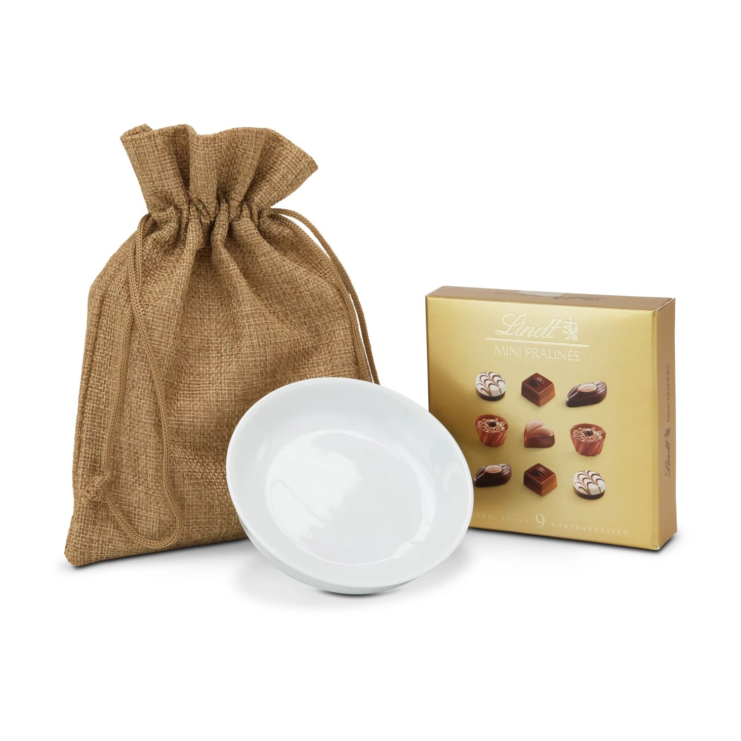 Kleine Kostbarkeiten machen das Leben aus! Dieses Set bietet Dir eine Auswahl an feinen Köstlichkeiten und die passende ansprechende Präsentation dazu. Geliefert wird eine edle Porzellanschale (ca. ø 10 cm), die sowohl funktional als auch ästhetisch ansprechend ist. Dazu gibt es 9 Lindt MINI PRALINÉS GOLD (44 g) für Deine erste Präsentation. Diese feinen Pralinen bieten eine exquisite Kombination aus feinster Schokolade und verschiedenen köstlichen Füllungen. Präsentiert wird das Geschenkset in einem Jutesäckchen. Diese Verpackungsvariante verleiht dem Set eine natürliche Note und rundet das Gesamtbild ab. So sind die kleinen Kostbarkeiten perfekt für besondere Anlässe, als Dankeschön oder einfach nur, um jemandem eine kleine Freude zu bereiten.