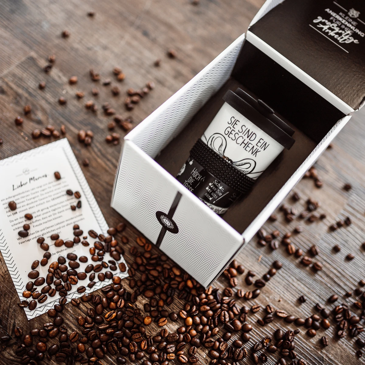Geschmückt wird das Coffee2go-Multitalent mit wunderschönen Botschaften, die jeder Mitarbeiter gerne hört. „Sie sind ein Geschenk“, „Auf Sie kann man bauen“, „Sie machen einen tollen Job“ und viele mehr – rundum den Becher können sich Deine Mitarbeiter an immer wieder neuen Lobhudeleien erfreuen. Ein wertschätzendes Geschenk, das in doppelter Weise die Herzen erwärmt.