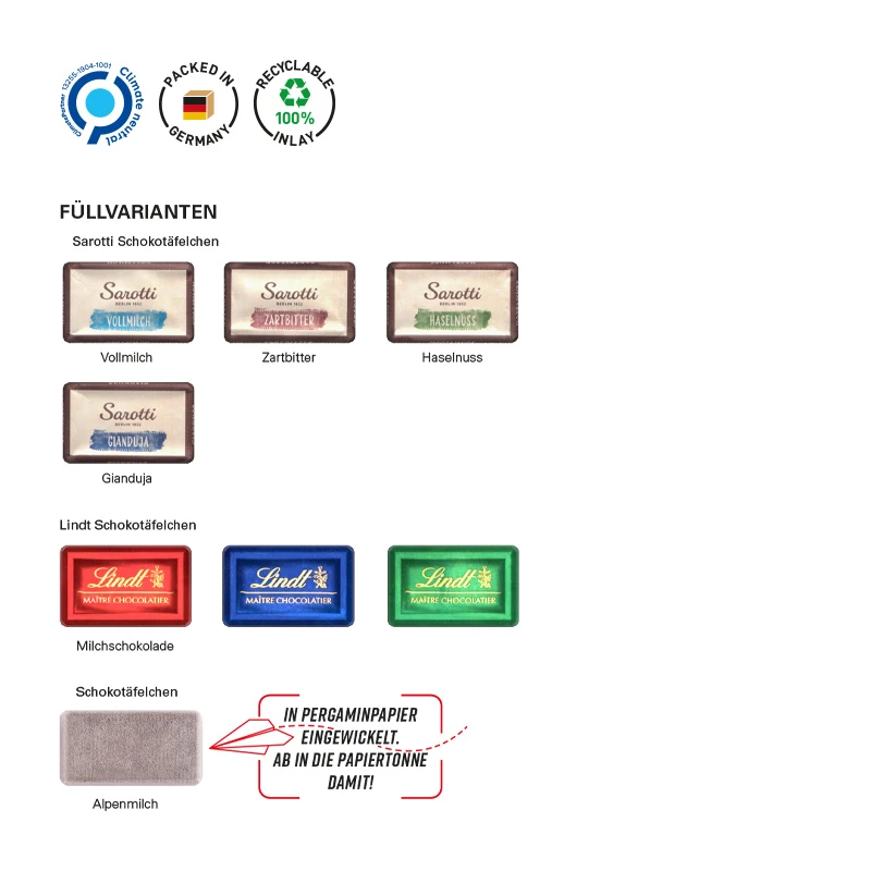 | Füllung: | 24 Sarotti Schokotäfelchen, 4 Sorten bunt gemischt |