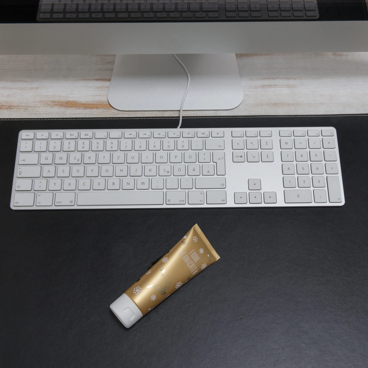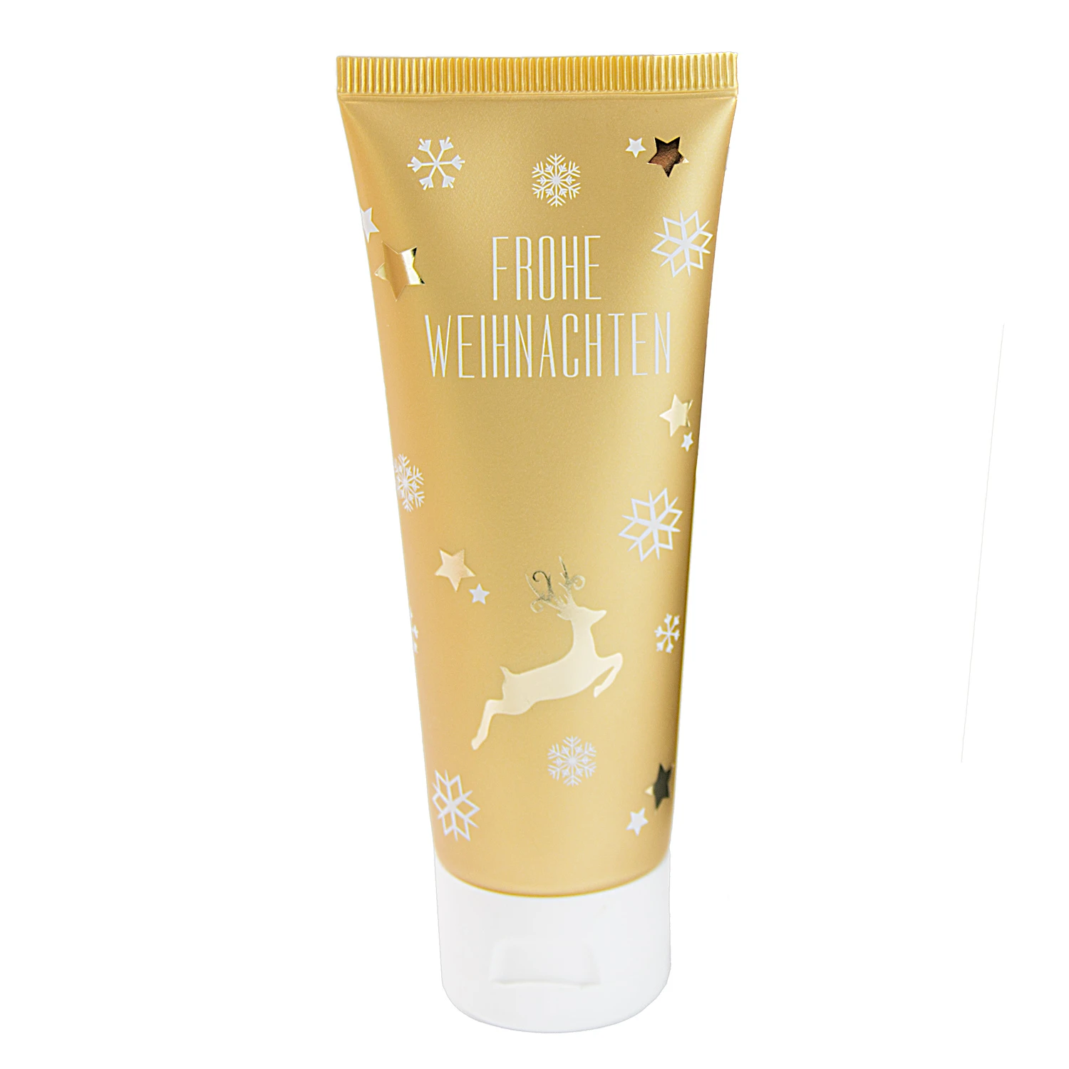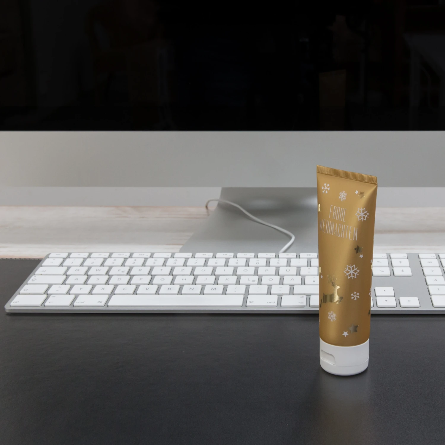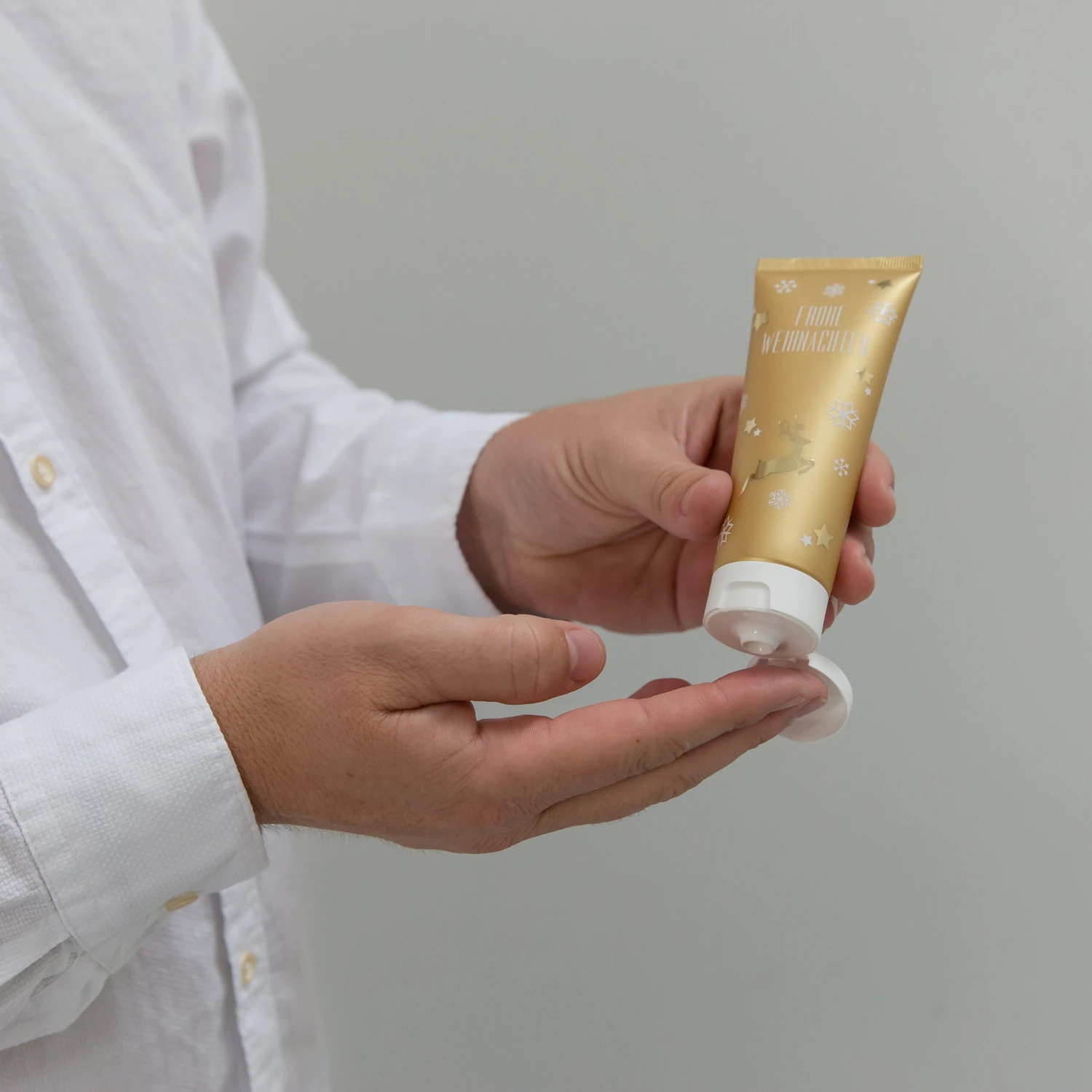 Der Bestseller: Unsere Hand- und Nagelcreme mit Aloe Vera jetzt auch als 75 ml Tube mit bereits vorgedrucktem „Frohe Weihnachten“-Motiv. Dermatologisch getestete, vegane Handcreme sensitiv mit pflegender Aloe Vera, Sheabutter, Avocadoöl und Mandelöl. Versorgt die Haut mit Feuchtigkeit durch intensive Hydration. Fettet nicht nach und zieht besonders schnell ein. Rezeptur ohne Mikroplastik. Die Tube kann sofort ab Lager wie abgebildet bestellt werden. Ein ergänzender Druck Deines Firmenlogos auf einem Logoaufkleber macht die Tube zu einem günstigen und einmaligen Give Away, das nicht nur die Hände sondern auch deine Kundenbindung pflegt!