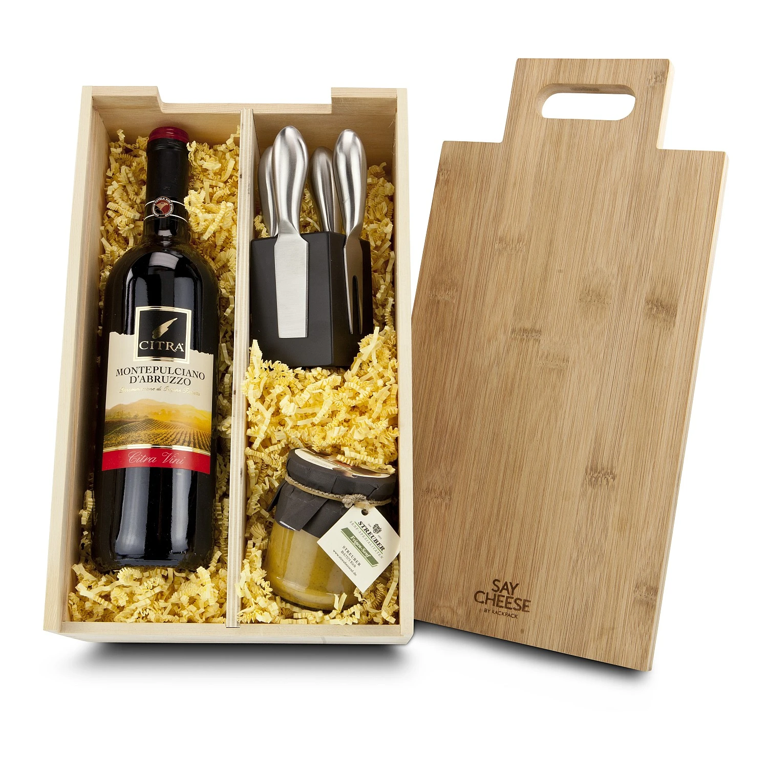 Einfach abziehen – und dann zeigt sich das Innenleben der Holzkiste: Eine Flasche italienischer Montepulciano (0,75 l), ein Glas Feigensenf (190 ml) und ein 5-teiliger, magnetischer ROMINOX®- Käsemesserblock. Käse und Trauben nur Deko.
