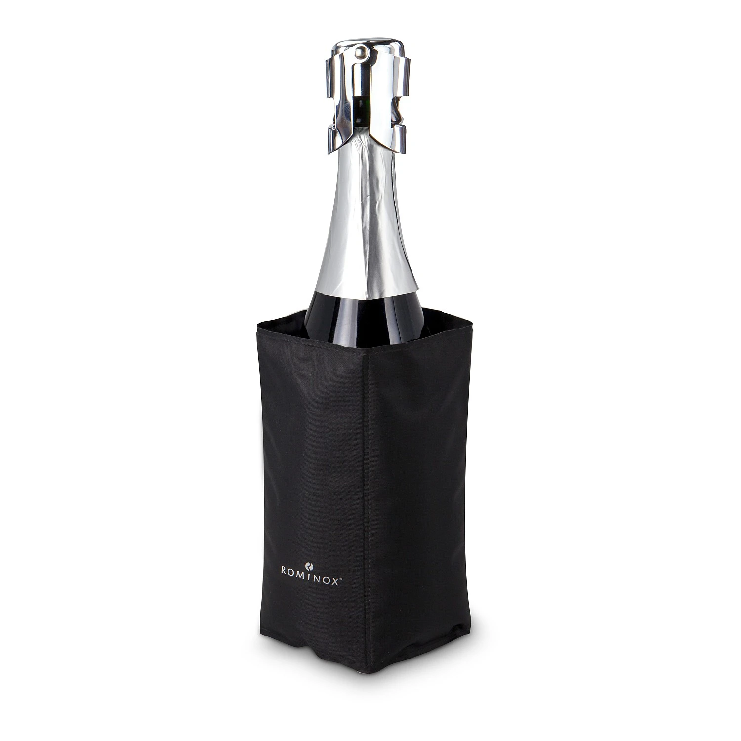 Ein edler Villa Römer Sekt trocken in schwarz-matter Flasche, kombiniert mit schwarzer Kühlmanschette und Sektverschluss. In schwarzem Geschenkkarton.