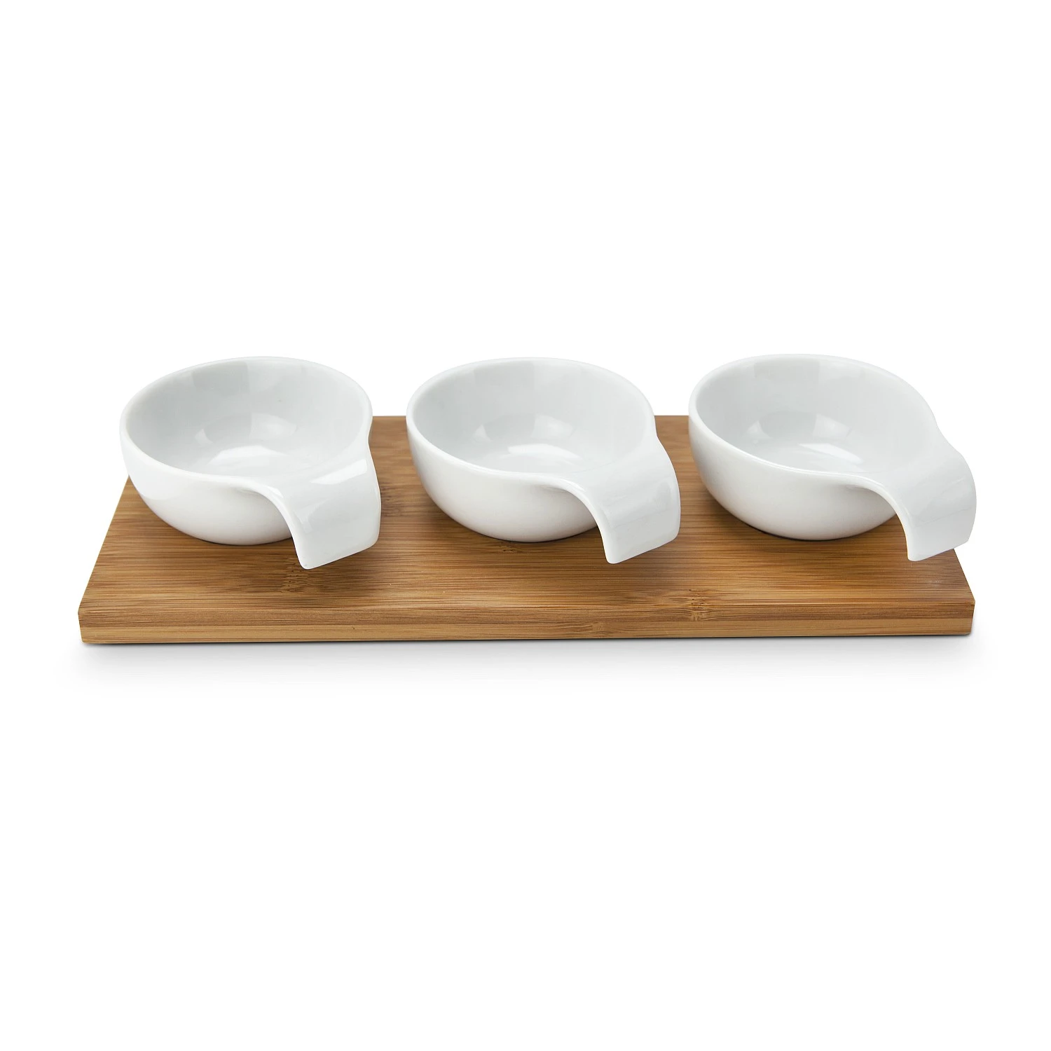 Schlichtes Bambusbrett mit 3 Keramik-Servierschalen (je ca. 8 x 10,5 x 3,5 cm), Natürlichkeit gepaart mit einem modernen, funktionalen Stil, Schutzgleiter auf der Unterseite (Bambus, Keramik)