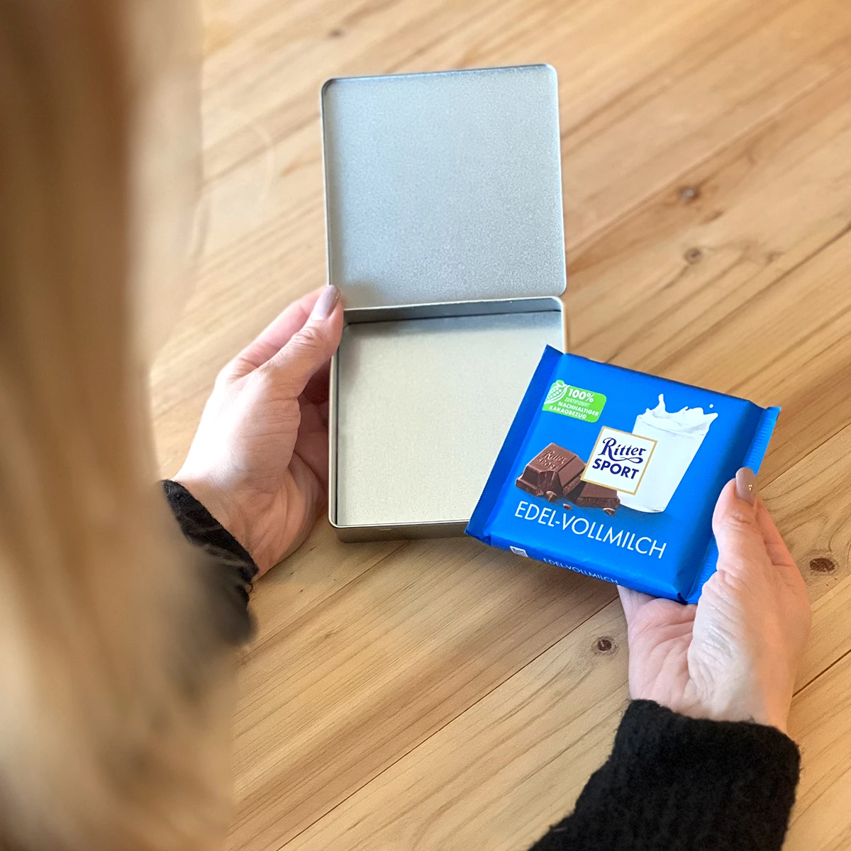 | Material: | 1x Ritter Sport 100 g – Edel-Vollmilch in wiederverwendbarer Dose, 1x Design-Etikett |
