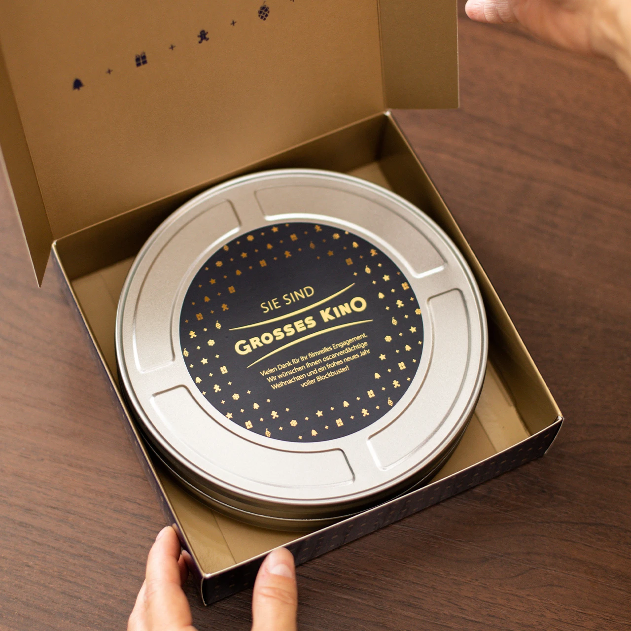 - Aufdruck: „Sie sind großes Kino – Vielen Dank für Ihr filmreifes Engagement. Wir wünschen Ihnen oscarverdächtige Weihnachten und ein frohes neues Jahr voller Blockbuster!“