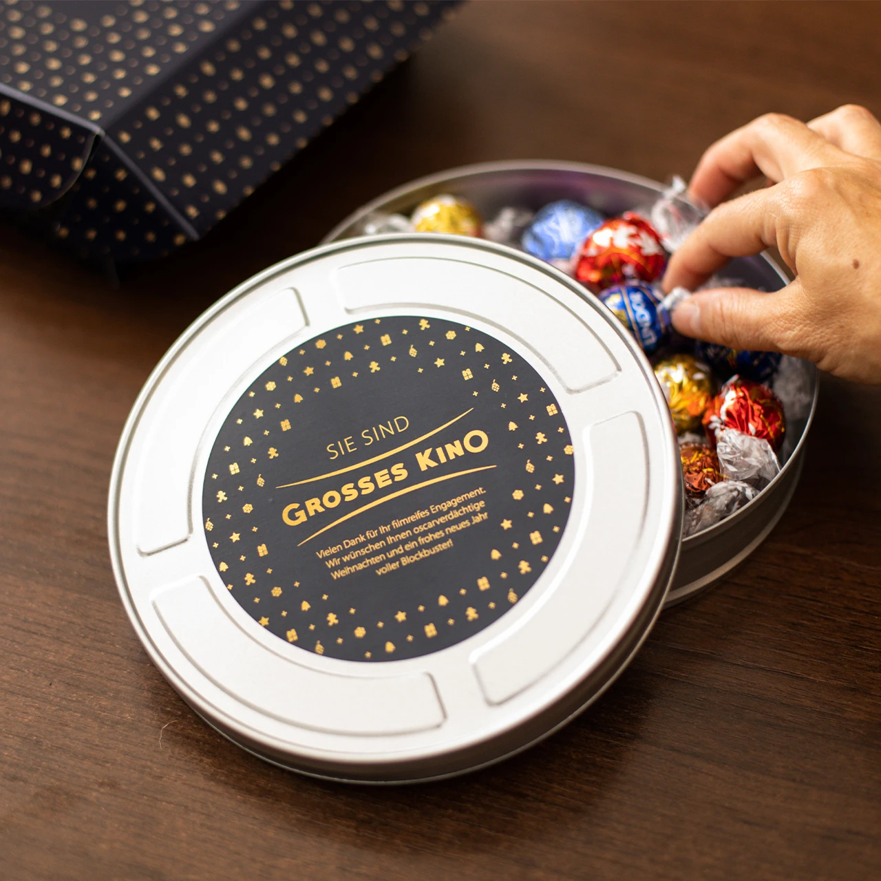 Deine Mitarbeiter sind die Stars in Eurem Unternehmen? Dann zeige es ihnen mit dieser originellen Filmdose! Bedanke Dich für die filmreife Leistung und wünsche oscarverdächtige Weihnachten und ein neues Jahr voller Blockbuster. Die hochwertige Kinodose ist gefüllt mit 24 zartschmelzenden Lindor-Pralinés und kann nach dem Genuss als praktische Aufbewahrungsbox weitergenutzt werden.
