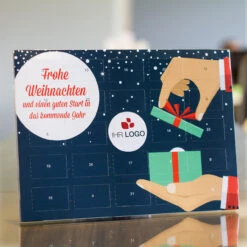 Den will jeder auf seinem Tisch haben! Der sympathische Adventskalender mit 24 Ritter SPORT Quadretties versüßt deinen Beschenkten garantiert die Adventszeit. Mit dem ausklappbaren Tischaufsteller ist der Kalender sofort einsatzbereit. Für das Design kannst Du entweder eine eigene Vorlage wählen oder Dich kostenlos bei unseren 250 Motivvorlagen bedienen. Wir individualiseren Dein Wunschmotiv gratis mit Deinem Logo und Wunschtext.