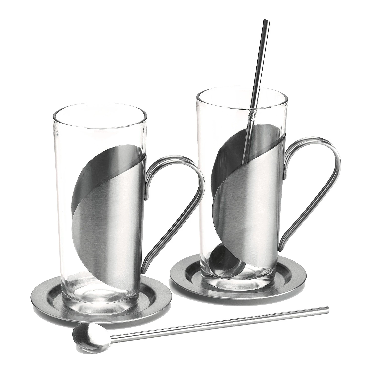 2 Teegläser mit klarer, linearer Formensprache, liegen sicher und ohne Hitzeübertragung in der Hand, inklusive 2 Untersetzer und 2 Trinkhalmlöffel, 6-teilig (hitzebeständiges Glas, Edelstahl – seidenmatt gebürstet)