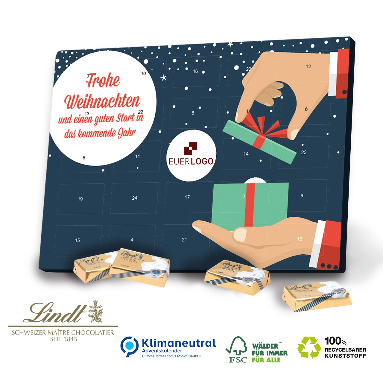 Tischkalender Lindt mit Weihnachtsmotiv und Deinem individuellen Logo