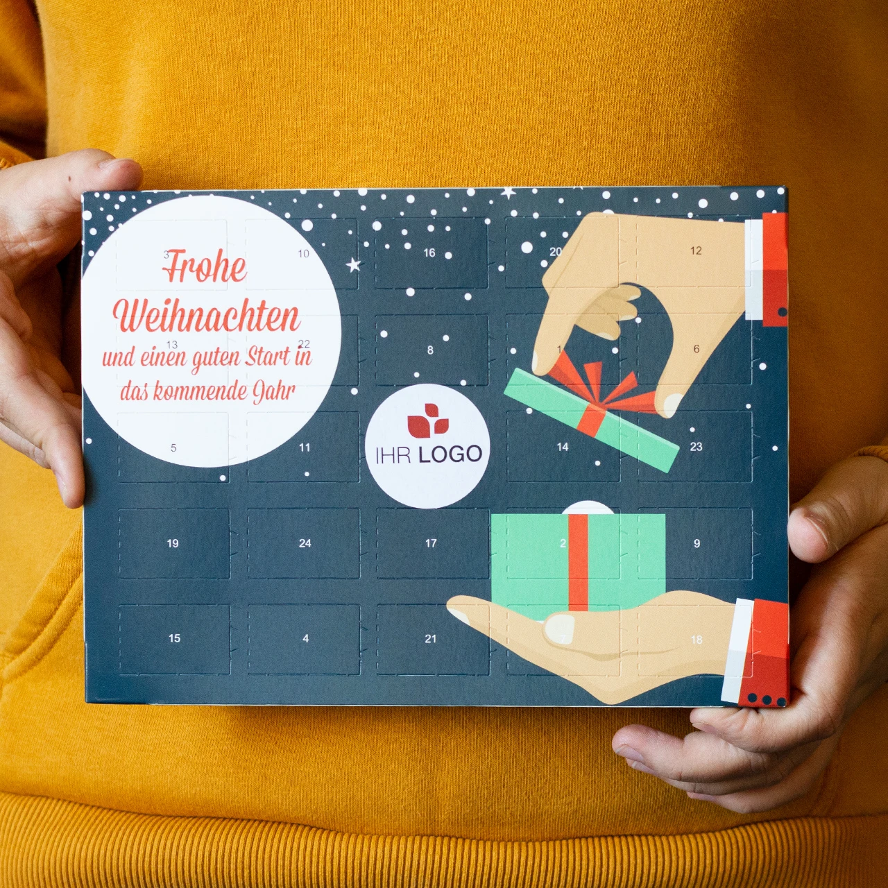 Begleite Deine Mitarbeiter, Kollegen und Kunden Tag für Tag mit feinster Alpen Vollmichschokolade von Lindt & Sprüngli durch die Adventszeit. Bei diesem attraktiven Tischkalender trifft moderne Grafik auf weihnachtliche Vorfreude. Im Mittelpunkt des Motivs wird euer Firmenlogo mit einem Aufkleber aufgebracht und steht damit im Zentrum der Aufmerksamkeit.