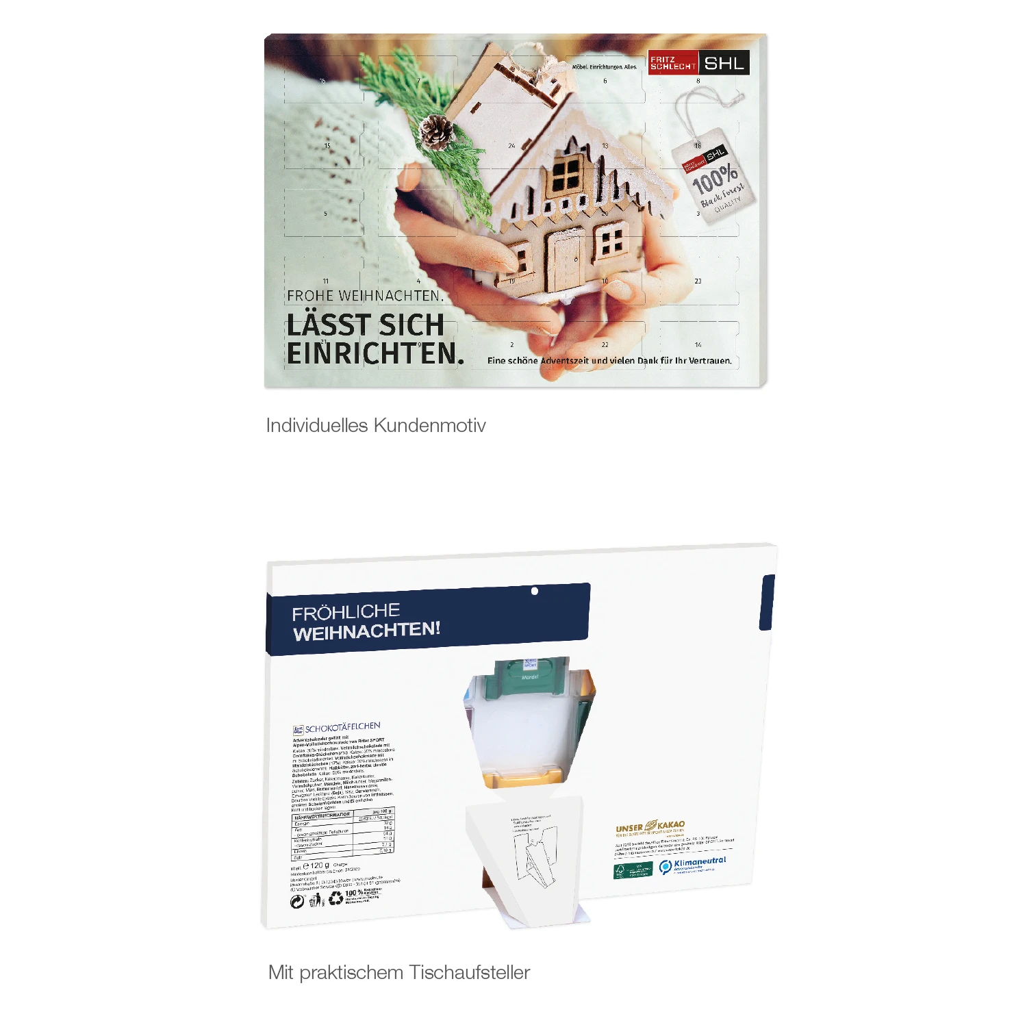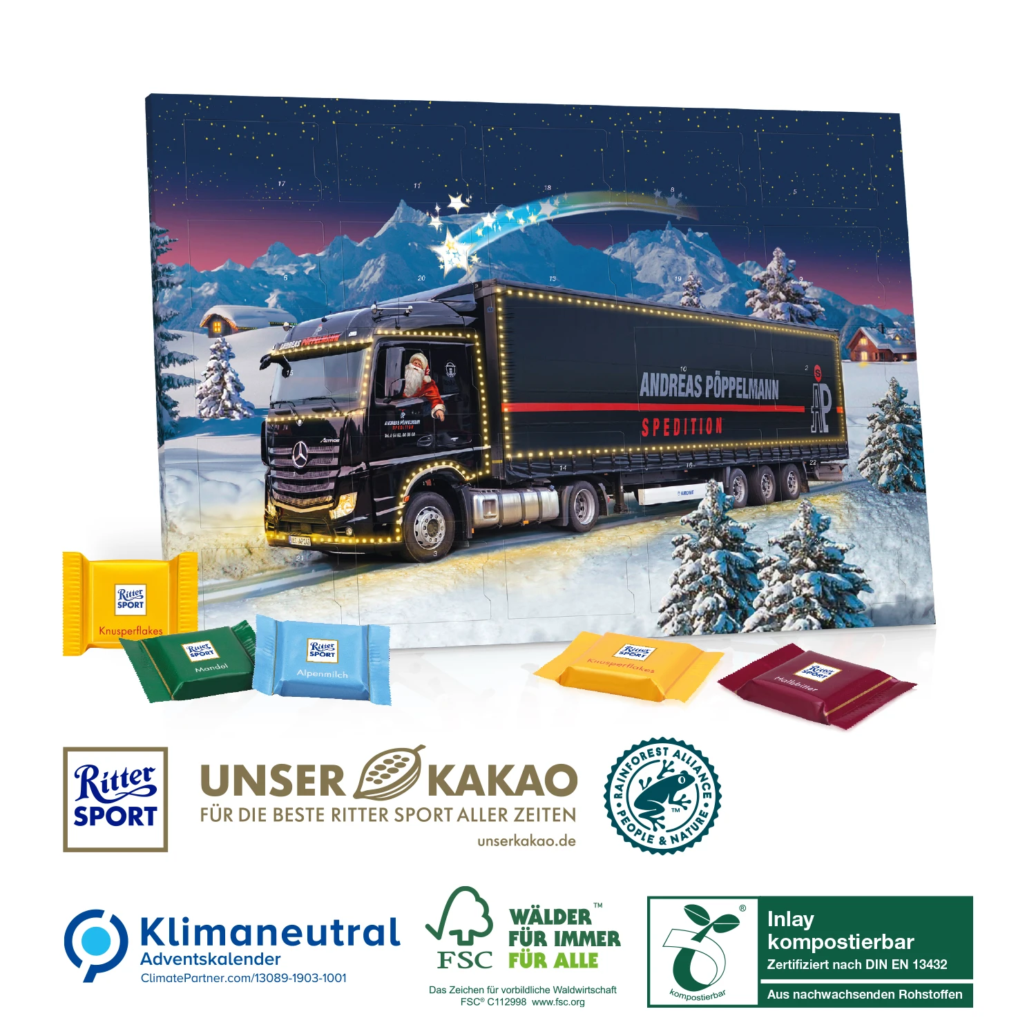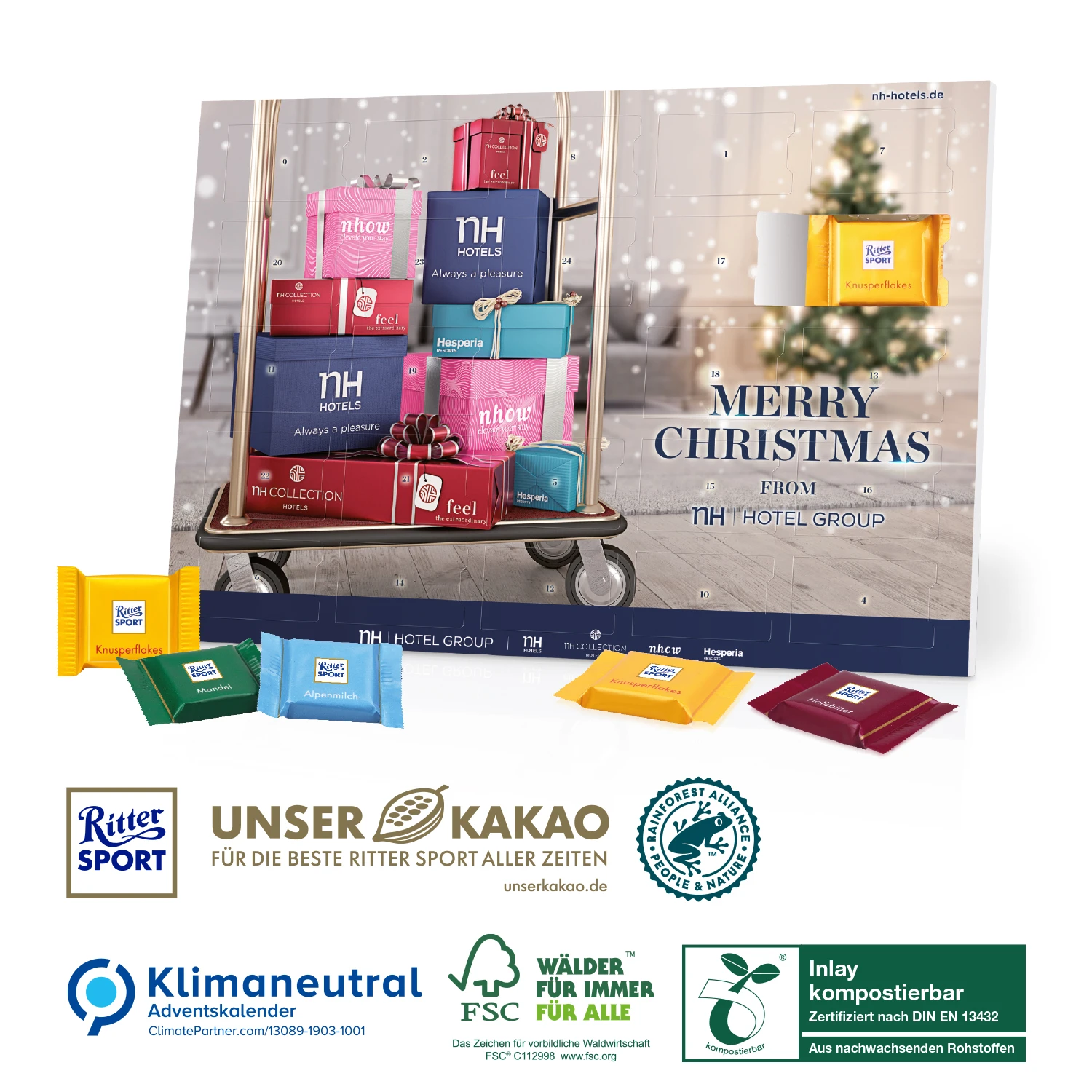 Werbung für jeden Geschmack! Ob Alpenmilch, Halbbitter, Knusperflakes oder Mandel: Immer verwöhnst Du Deine Kunden mit bester Ritter SPORT Qualität. Die FSC®-zertifizierte Kalenderhülle ist rundum bedruckbar. Ein gelungenes Präsent für Deine Werbebotschaft