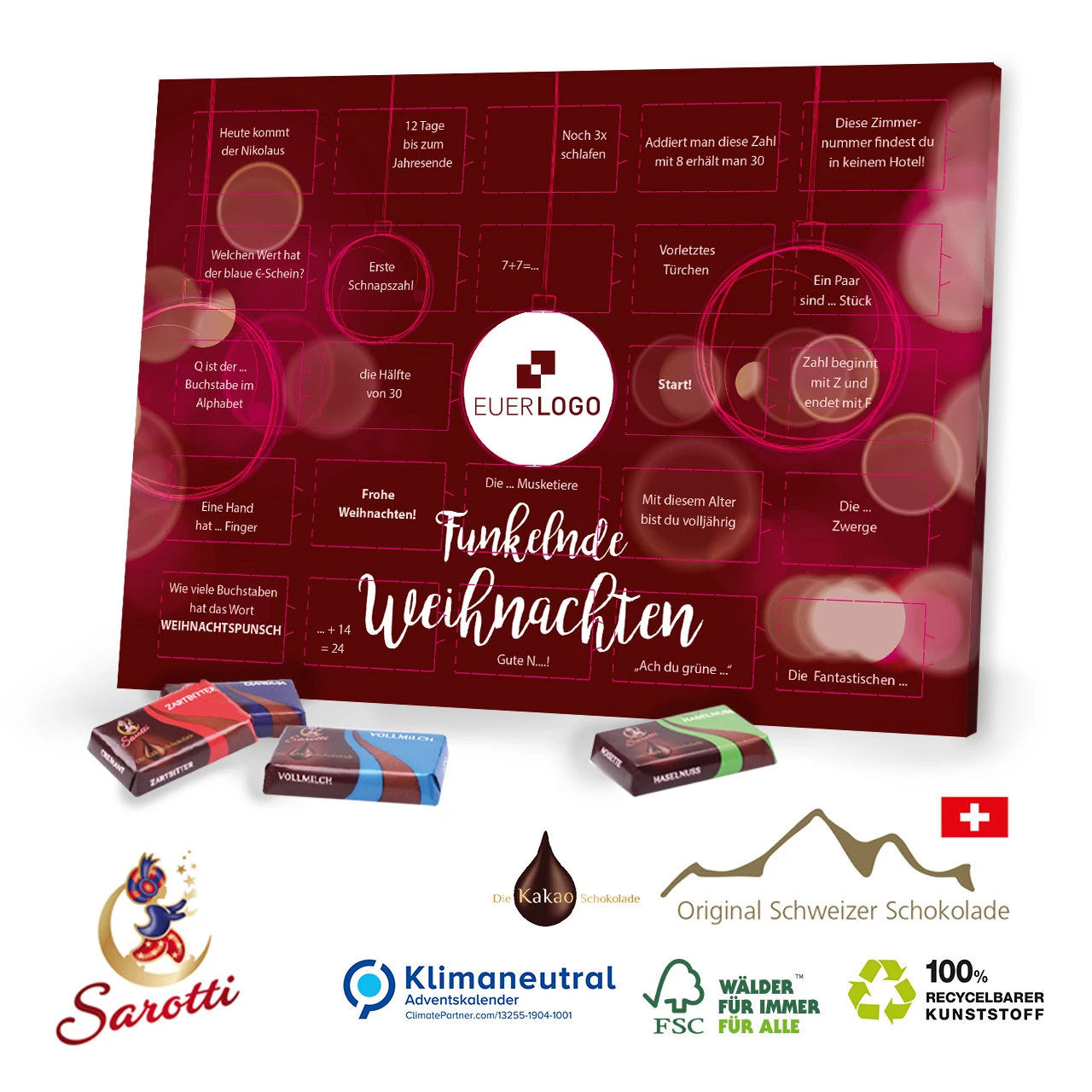 Dieser Tischadventskalender mit Weihnachtskugeldesign bekommt garantiert einen Ehrenplatz auf dem Schreibtisch Deiner Mitarbeiter, Kollegen und Kunden. In der zentralen Kugel prangt Dein Logo in Form eines Aufklebers und erinnert jeden Tag daran, wer die Wartezeit auf das Fest mit feinsten Markenschokoladen von Sarotti versüßt. Sofort lieferbar – schon ab 10 Stück! Im Mittelpunkt des Motivs wird eurer Firmenlogo mit einem Aufkleber aufgebracht und steht damit im Zentrum der Aufmerksamkeit.