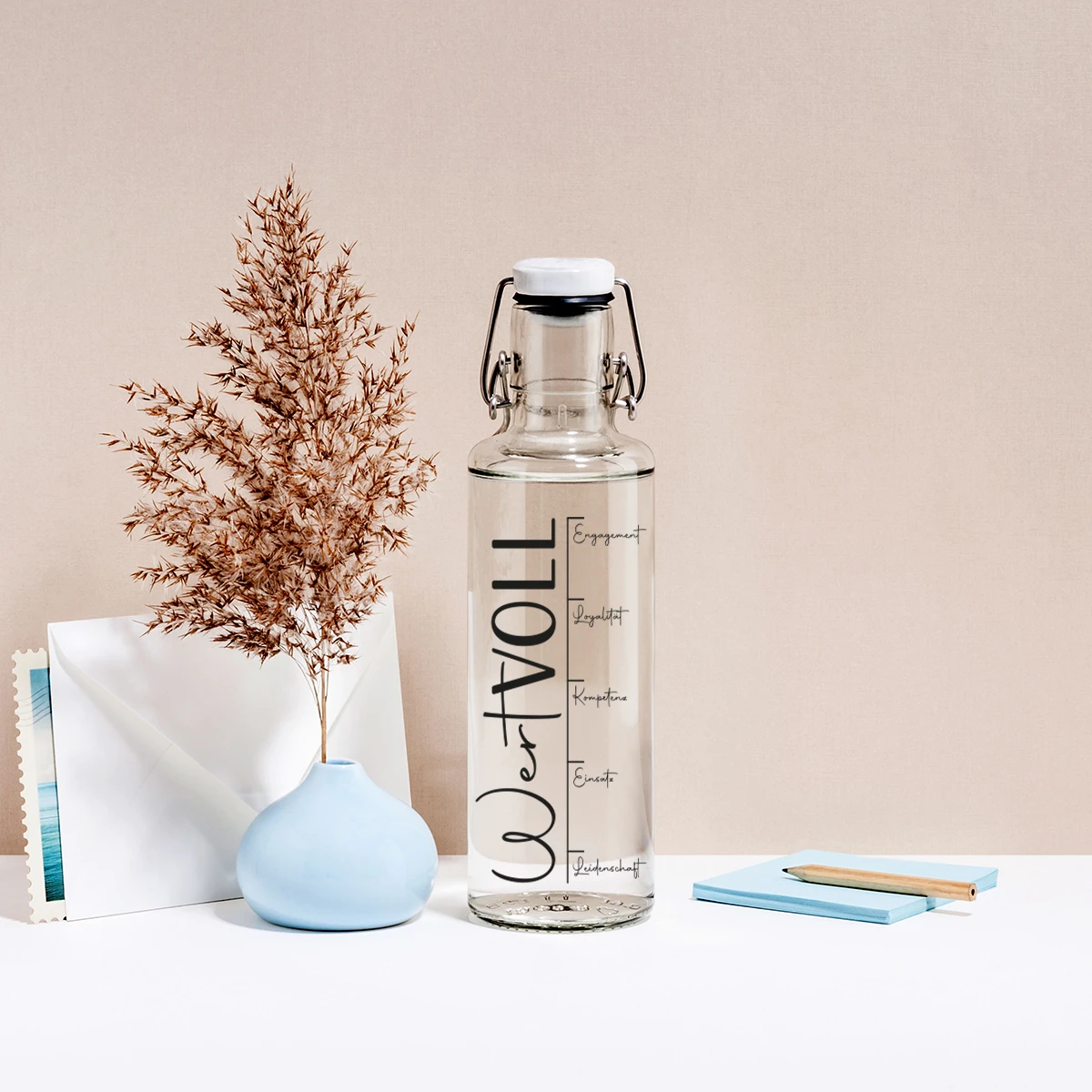 Dann gebe ihnen etwas zurück und erinnere sie jeden Tag an ihre Stärken und daran, wie wertvoll sie für Dich und Dein Unternehmen sind. Mit unserer hochwertigen Glasflasche mit Keramikdeckel und Edelstahlbügel verschenkst Du ein nachhaltiges, plastikfreies Geschenk und tust damit nicht nur Deinen Mitarbeitern etwas Gutes, sondern auch der Umwelt.
