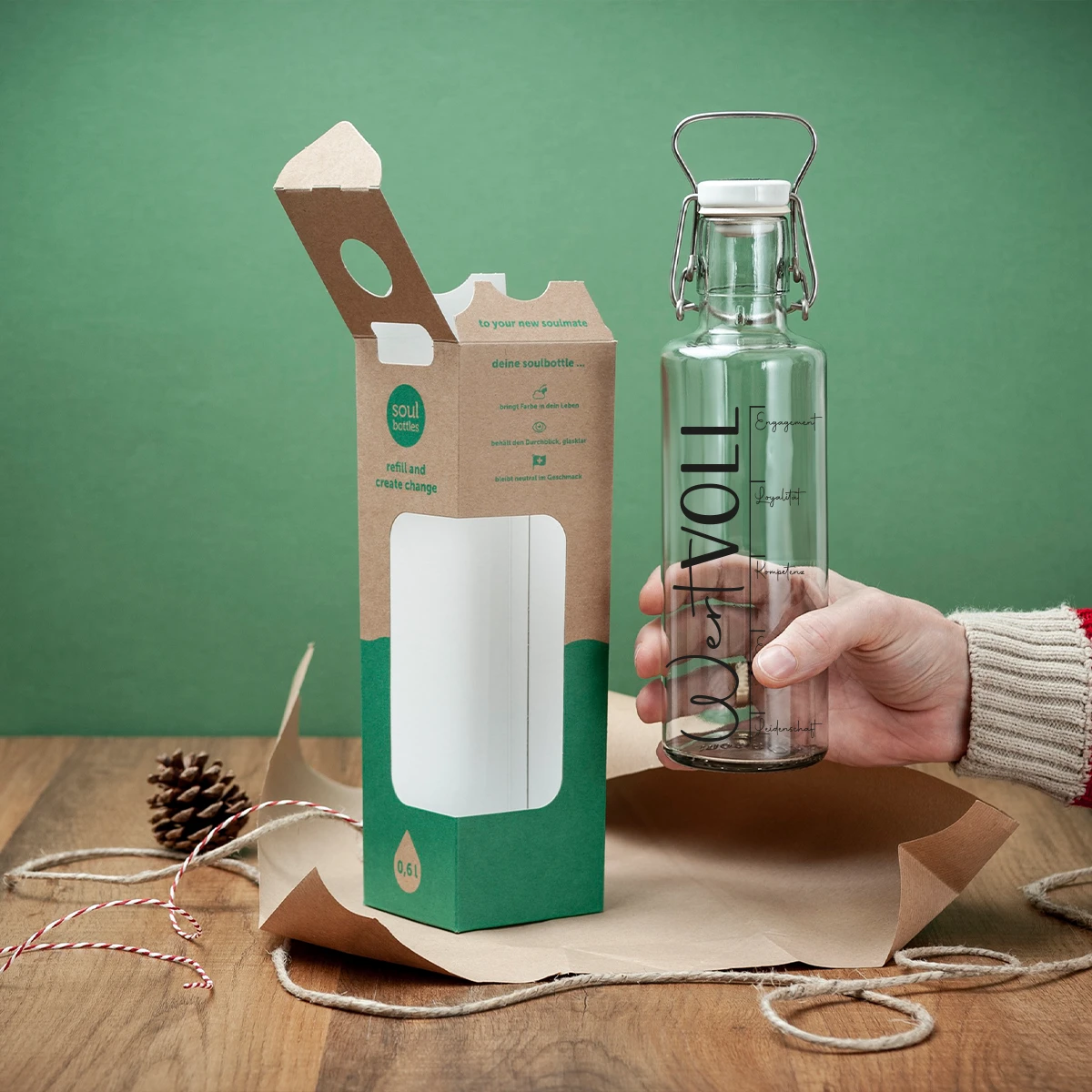| Material: | Soulbottle Glasflasche (0,6l) in einer schönen Kartonage |