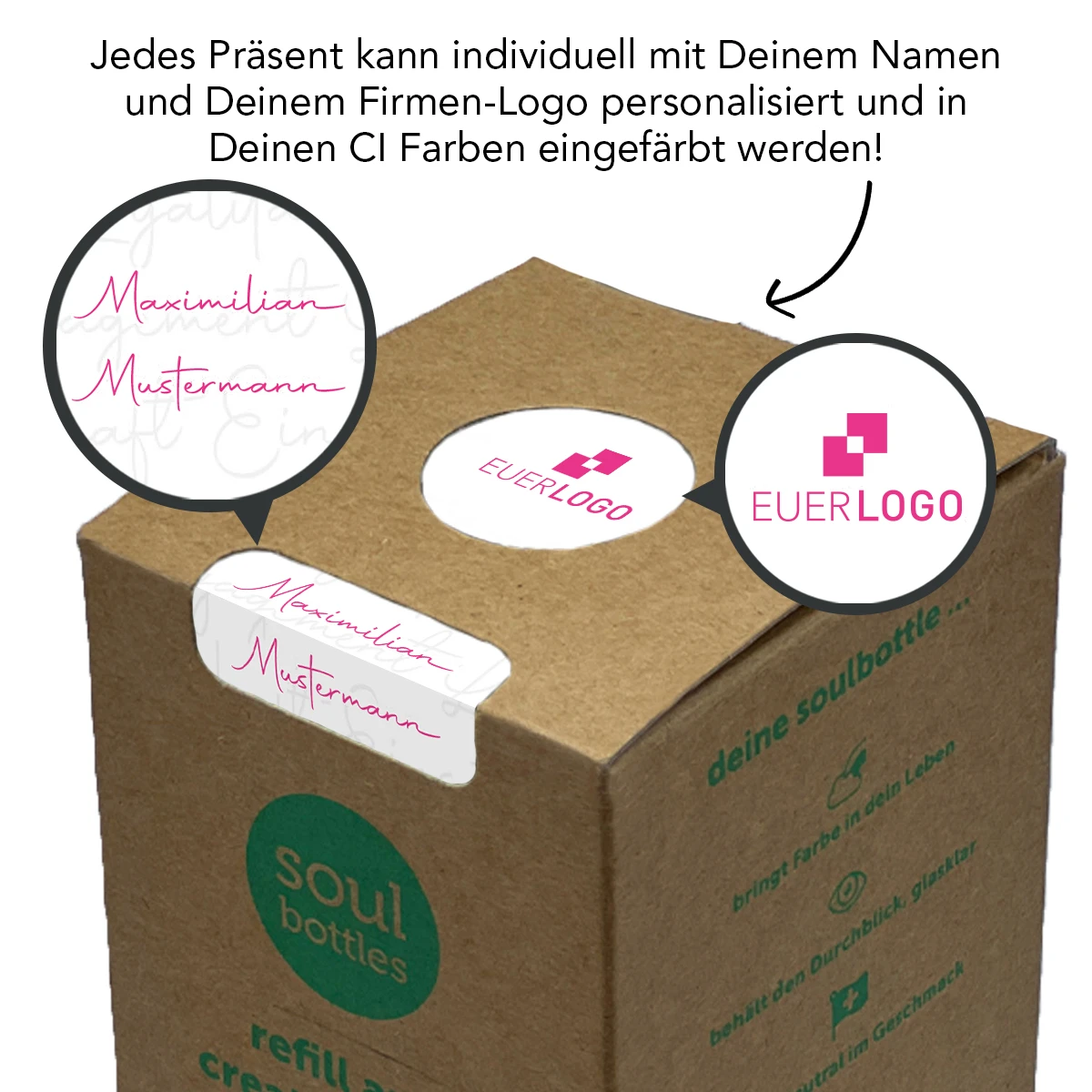 - Optional: Bereits ab 1 Stück kann der Einleger mit individuellen Namen und Eurem Logo bedruckt werden.