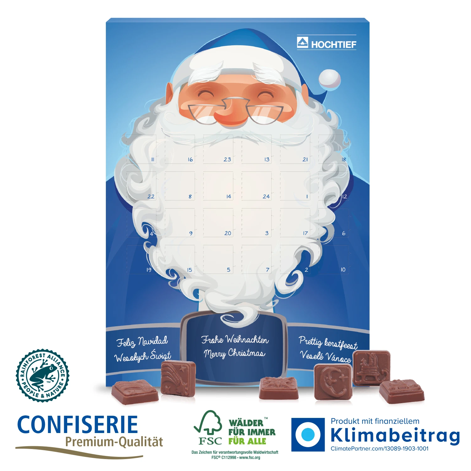 Unser Klassiker mit Top Preis-Leistung! Wand-Adventskalender in hochwertiger Verarbeitung und mit feiner Schokoladenfüllung. Damit sicherst Du Dir Sympathiepunkte und positives Feedback