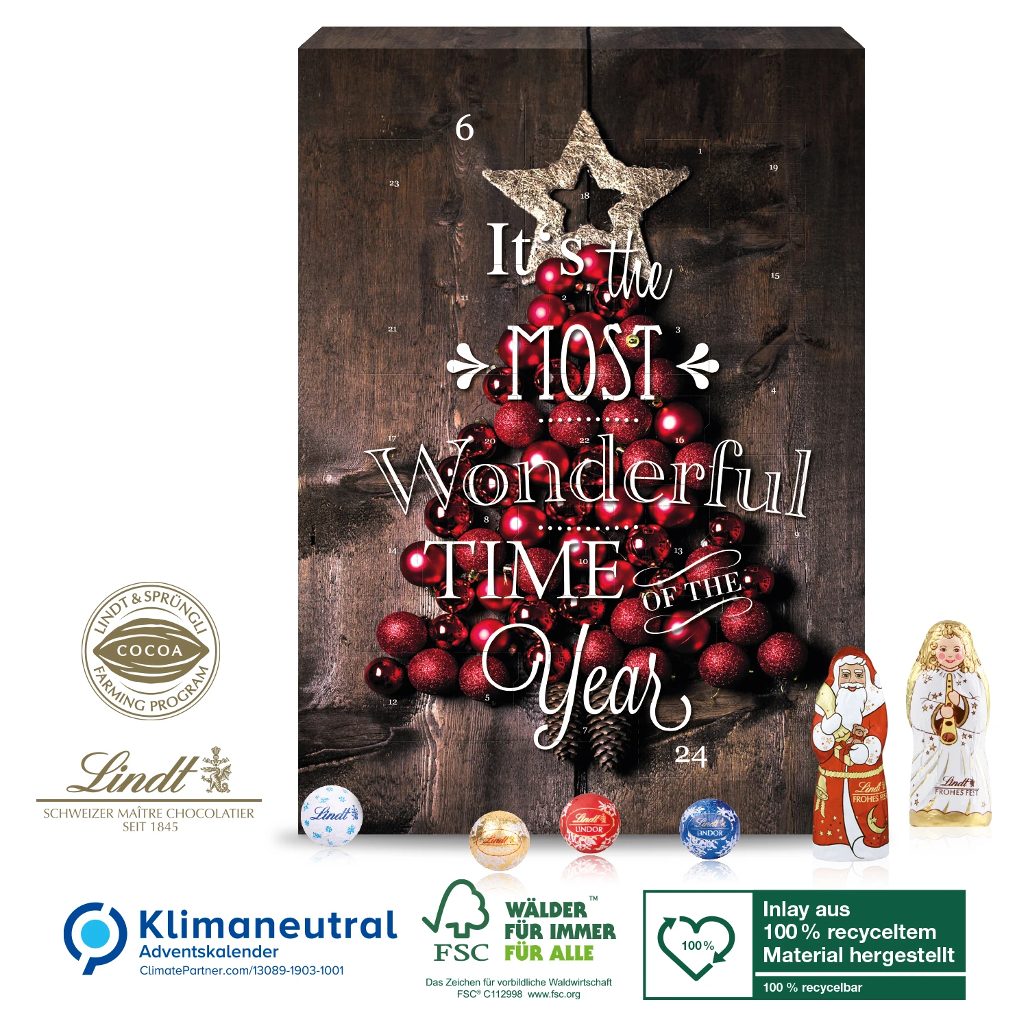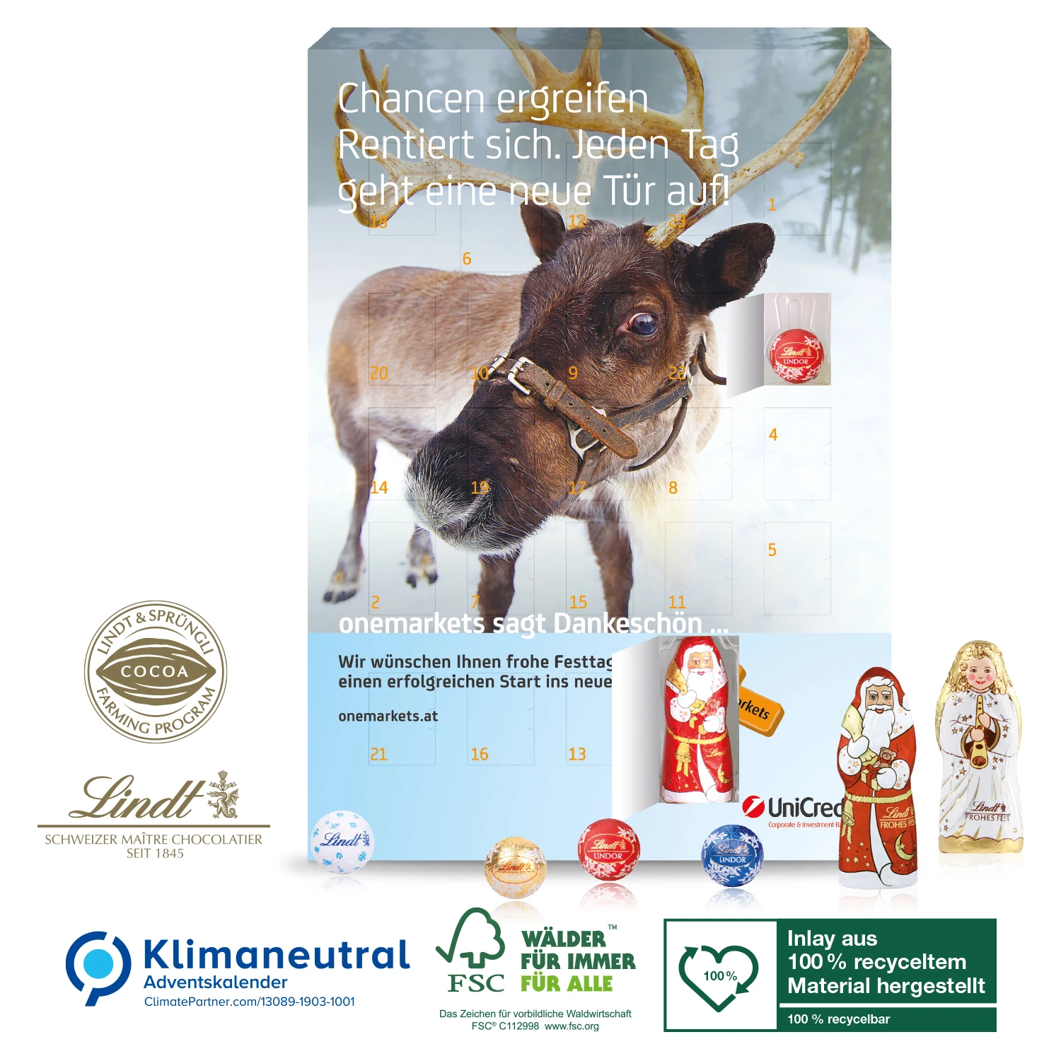 Das Spitzenmodell mit ganz exklusiver Füllung! Adventskalender in herausragender Qualität. Feinste Lindt Minis, sowie ein Lindt Weihnachtsmann und ein Lindt Weihnachtsengel lassen Kunden- wie Mitarbeiterherzen höher schlagen. Wähle aus über 250 Motivvorlagen und fordere jetzt Deinen GRATIS-Entwurf an!
