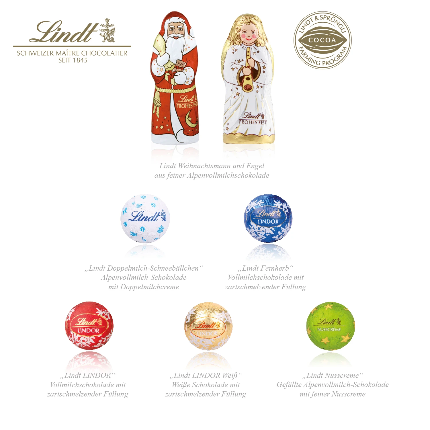 | Füllung: | 22 Stück Lindt Minis sowie zwei Lindt Weihnachtsfiguren (ca. 120 g) |