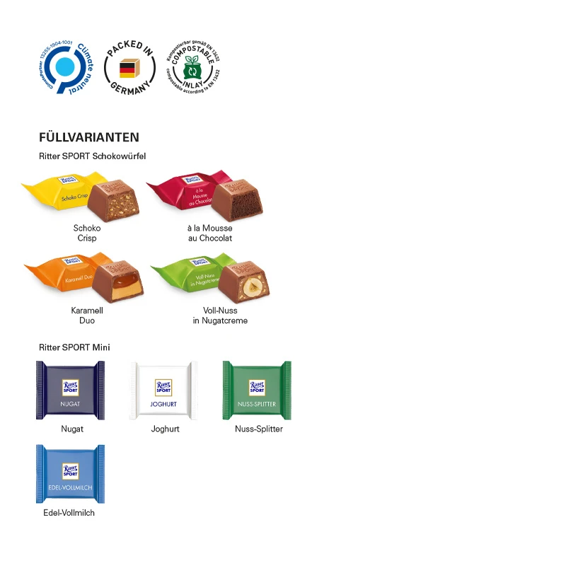 | Füllung: | 24 Schokoladentäfelchen der Marke Ritter SPORT, bunt gemischt, 120 g |