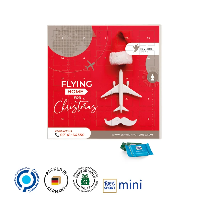 In Form durch die Weihnachtszeit: Der Adventskalender mit individuell bedruckbarem Deckblatt bietet 24 Türchen mit leckeren Ritter SPORT Mini Schokotäfelchen.