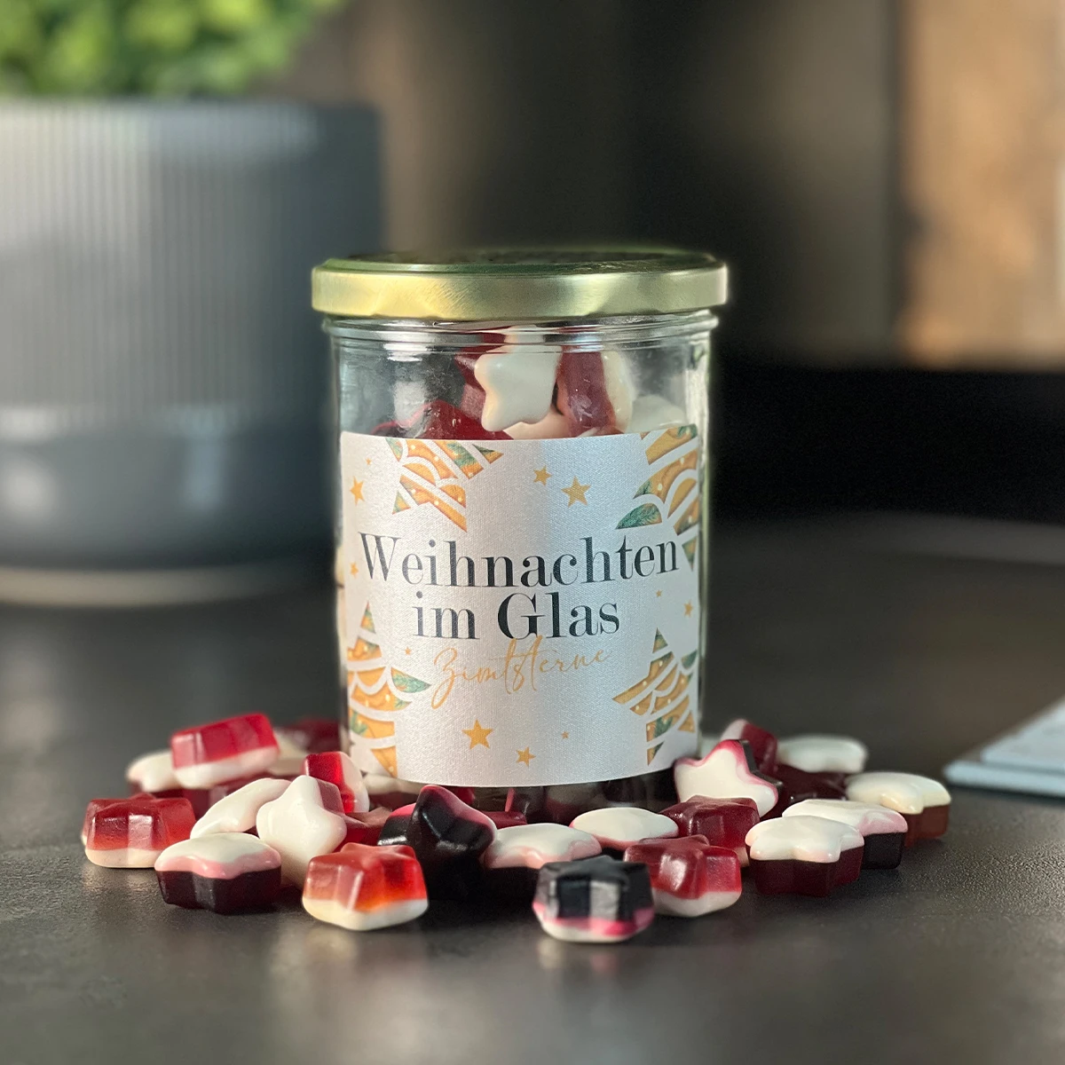 - Aufdruck auf dem Etikett: „Weihnachten im Glas – Zimsterne“