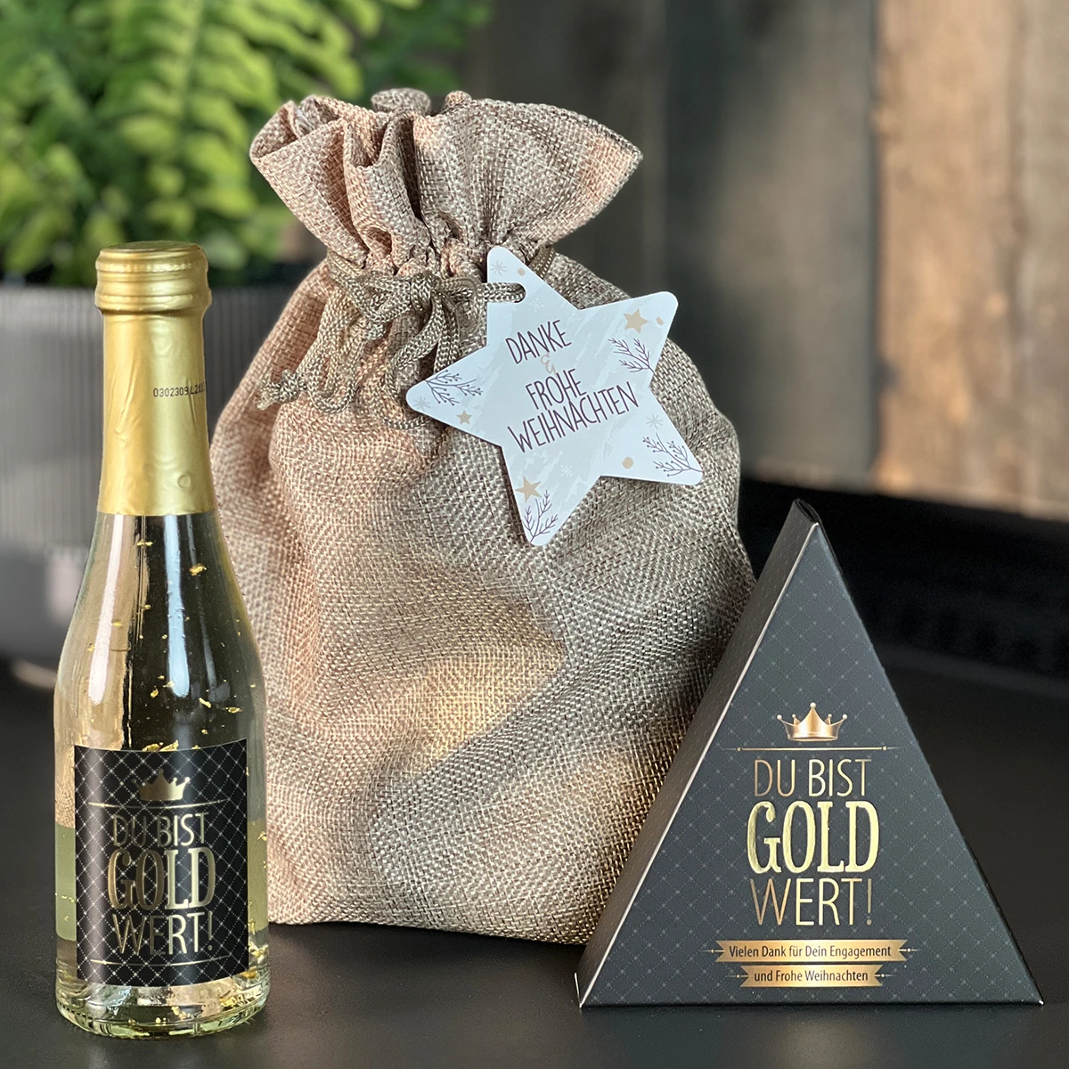 | Material: | 1x Secco (0,2l) versetzt mit echtem Blattgold, 1x Lindt Pyramide mit 6 Lindt Lindor – Pralinés, 1x Jutesäckchen, 1x Hangtag |