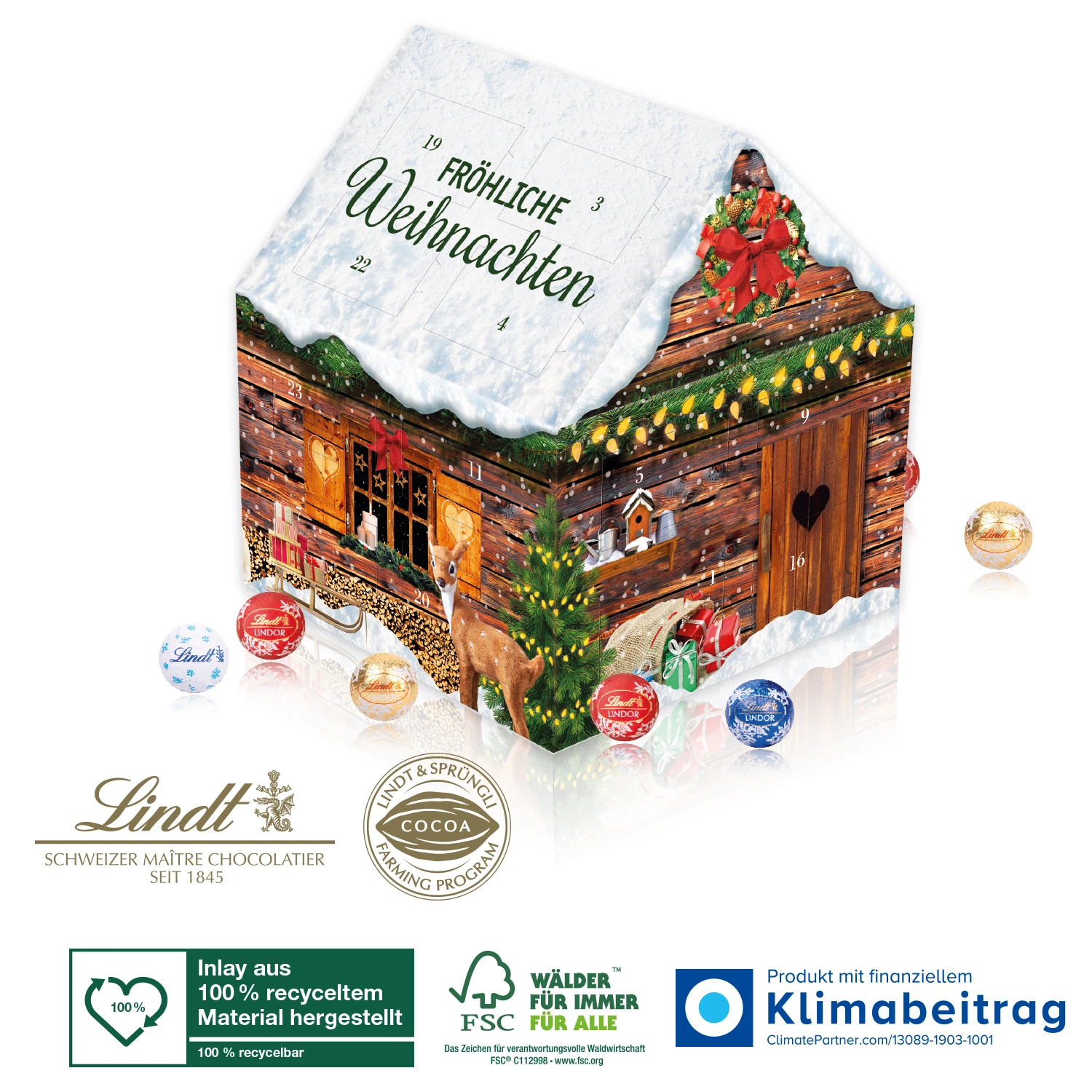 Begeisterung für das Besondere! Dieser Adventskalender findet sicher einen Ehrenplatz in den Büros Deiner Kundinnen und Kunden. Begeistere Deine Zielgruppe mit der attraktiven Form als „Weihnachtshaus“, und einer exklusiven Füllung von Lindt. Ein unvergessliches und hochwertiges Kundengeschenk