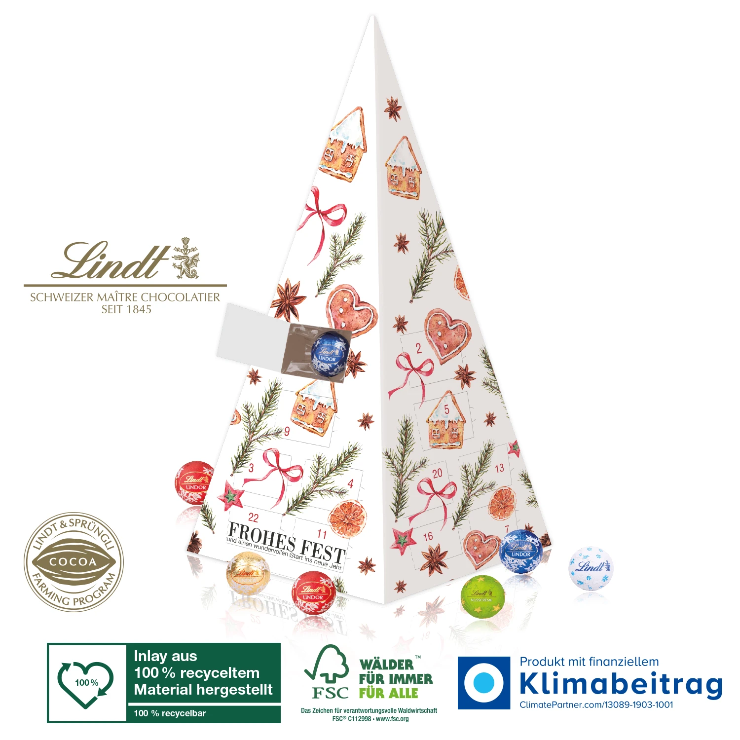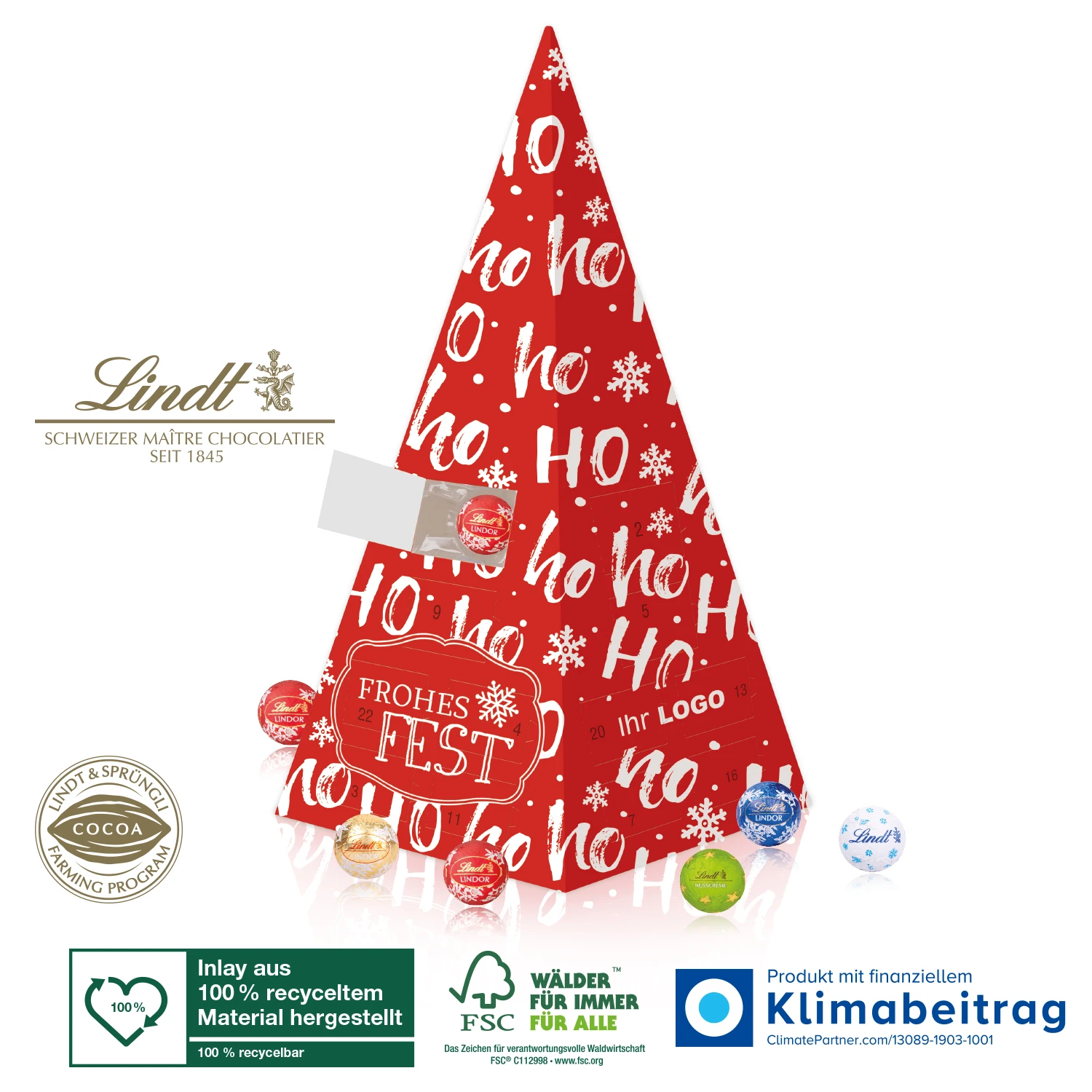 Auffälliger Adventskalender mit feinster Schokolade! Hinter den 24 Türchen verbergen sich zartschmelzende Lindt „Minis“ in vier Geschmacksrichtungen. Damit bereitest Du Deiner Kundschaft und Deinem Personal jeden Tag einen süßen Moment. Der Kalender ist rundum individuell bedruckbar. Damit wird Dein Weihnachtspräsent zum unvergesslichen Highlight