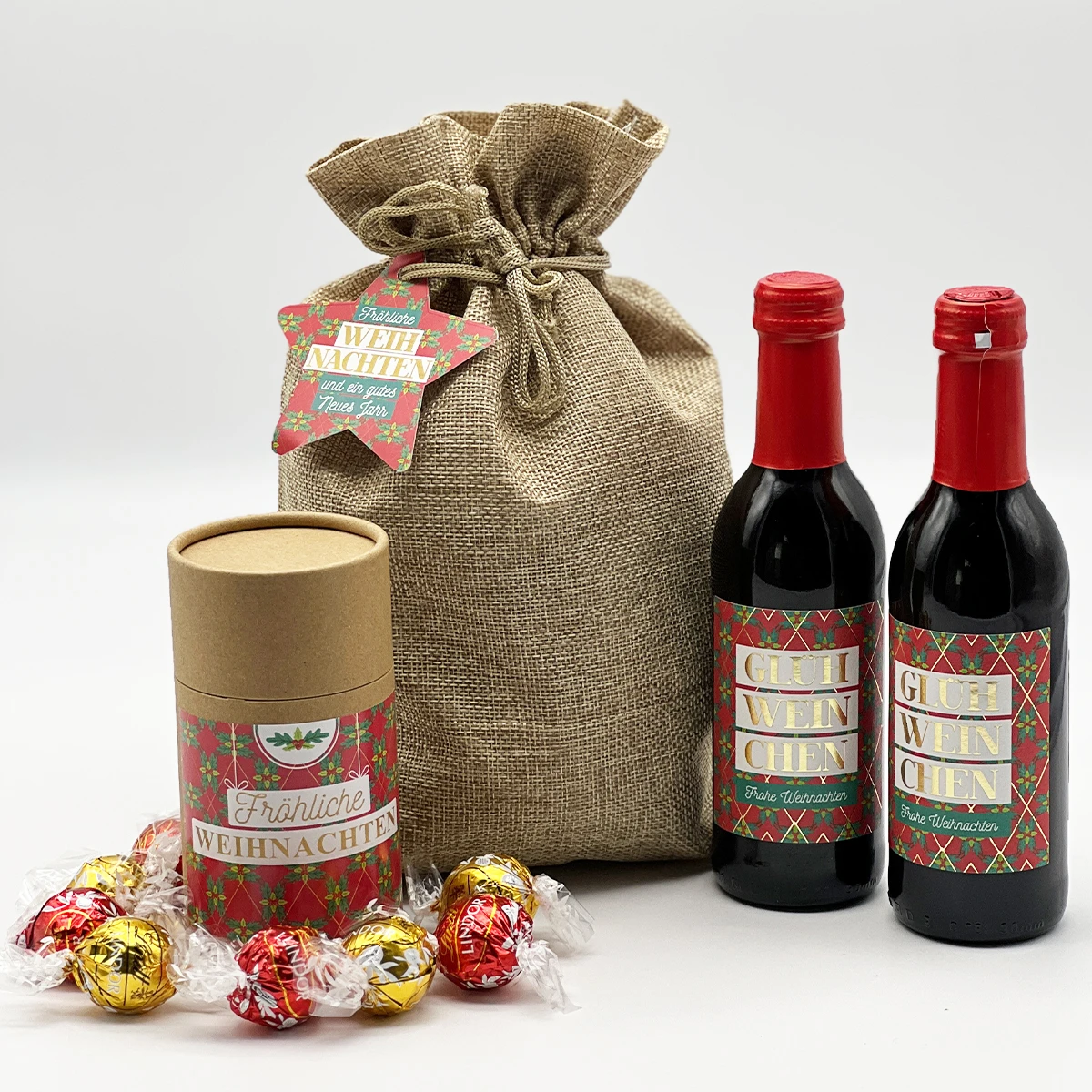 | Material: | 2x Glühwein (0,25l), 1x Präsenthülse „Fröhliche Weihnachten“ gefüllt mit 8 Lindt Lindor-Pralinés (Vollmilch & weiße Schokolade), 1x Jutesäckchen, 1x Hangtag |