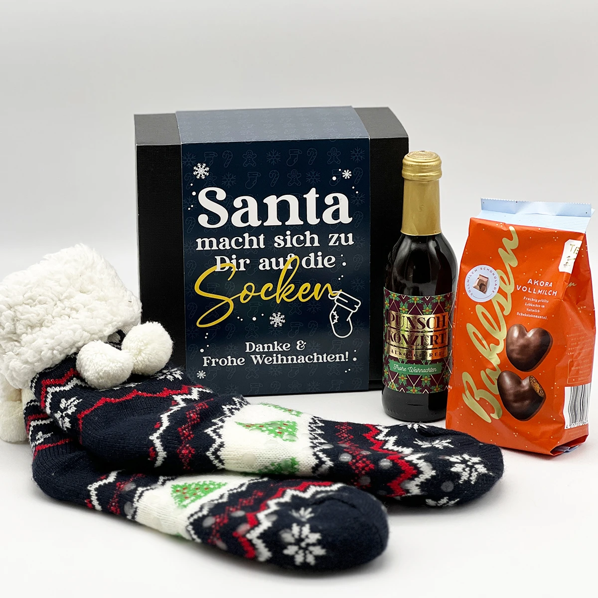 | Material: | 1x kuschelige Weihnachtssocken, 1x Punsch (0,25l), 1x Bahlsen Akora Vollmilch Lebkuchenherzen (150g), 1x Geschenkkarton, 1x Design-Banderole |